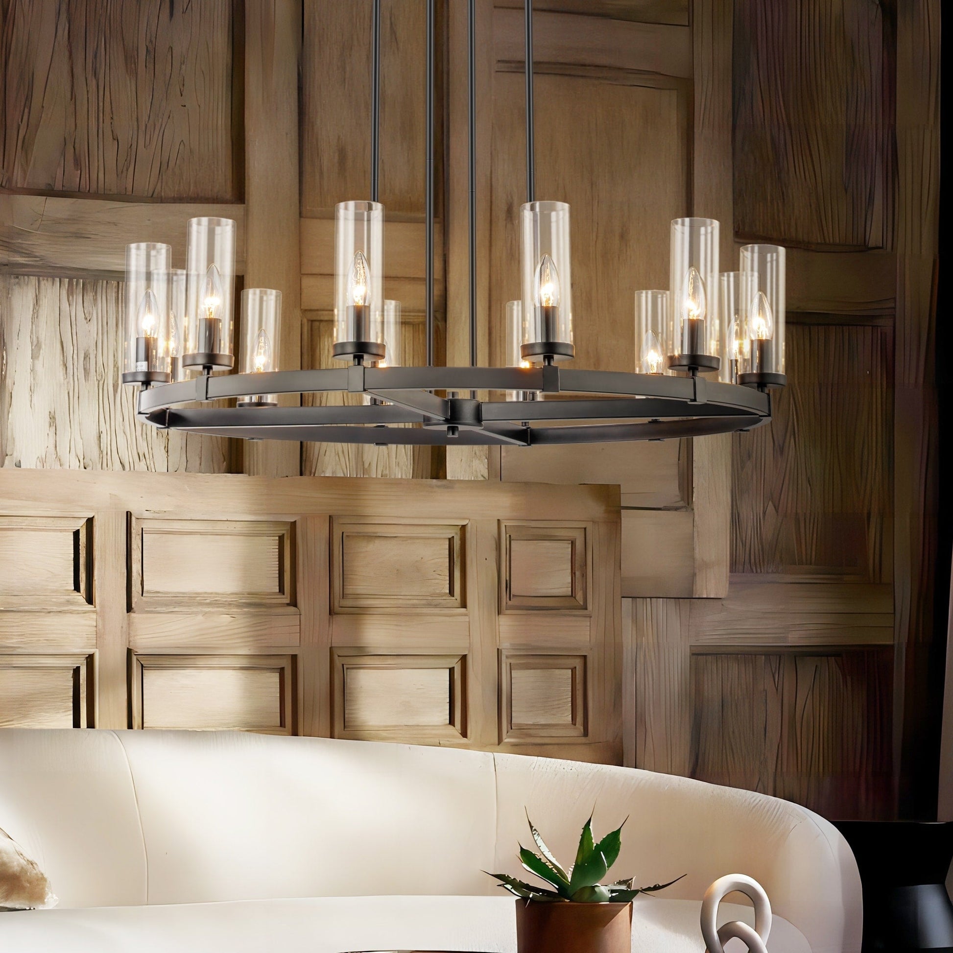 12-Light Mid-Century Modern Cylinder Clear Glass Wagon Wheel Chandelier Gold/Black Large Chandelier