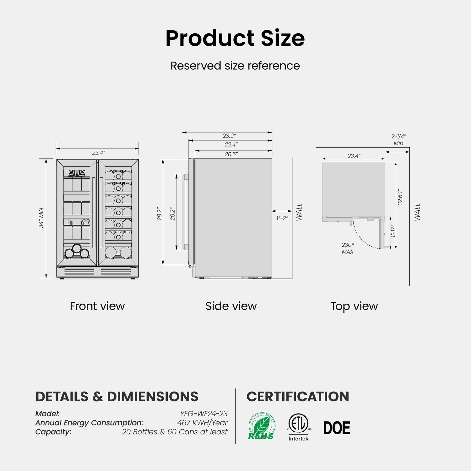24 Inch Wine/Beverage Refrigerator Cooler, 20 Bottle/60 Can DUAL ZONE Fridge - 24 inch