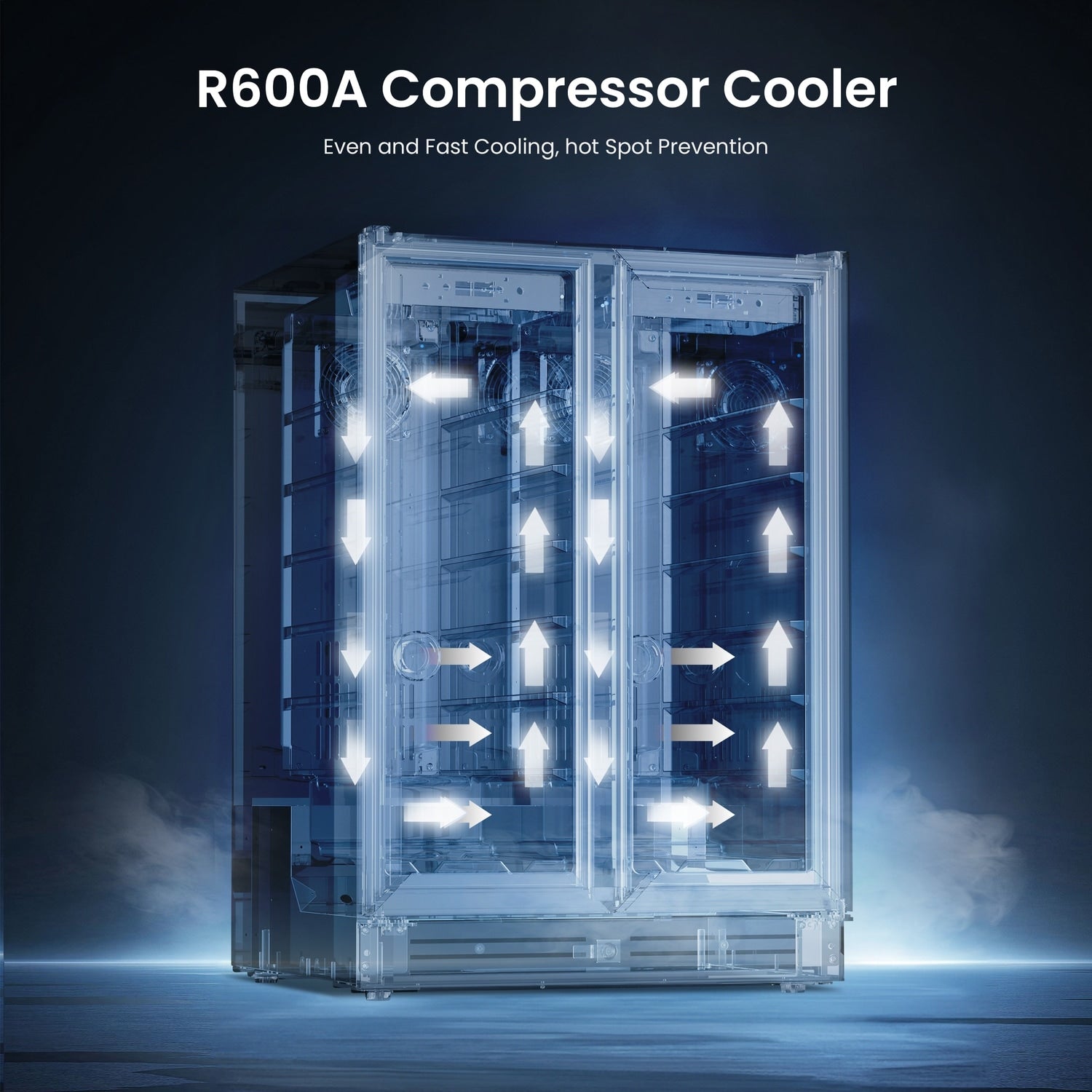 - Eco-Friendly and Efficient Cooling: Featuring R600a refrigerant and DOE certification, the Yeego Wine Beverage Cooler offers fast, even cooling while saving energy. The front-venting fan system enhances air circulation and heat dissipation, while the activated carbon filter removes odors, maintaining a fresh environment inside this wine beverage refrigerator.