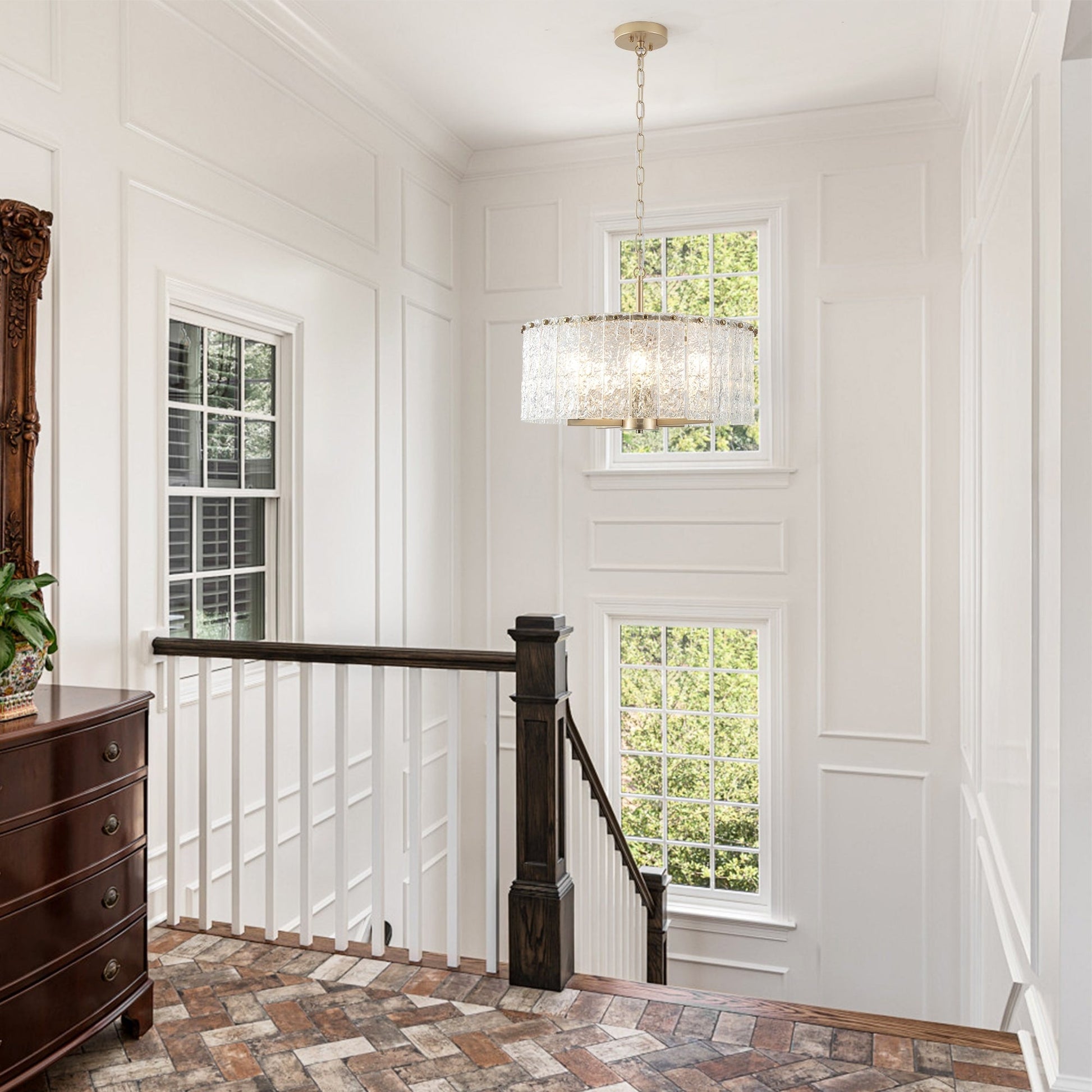 Illuminate your kitchen island with elegance using our Drum-shaped Pendant Light. Featuring a stunning design with crystal accents, this fixture exudes sophistication and luxury. With five lights and an upward light direction, it provides ample illumination while adding a touch of glamour to your space. Crafted from high-quality metal, glass, and real Chinese K9 crystal, it ensures durability and a luxurious aesthetic. The adjustable length allows for flexible positioning, while its compatibility with sloped ceilings offers versatile installation options. Perfect for dry locations, this pendant light combines style and functionality to enhance any kitchen ambiance. Please note: bulbs are not included.