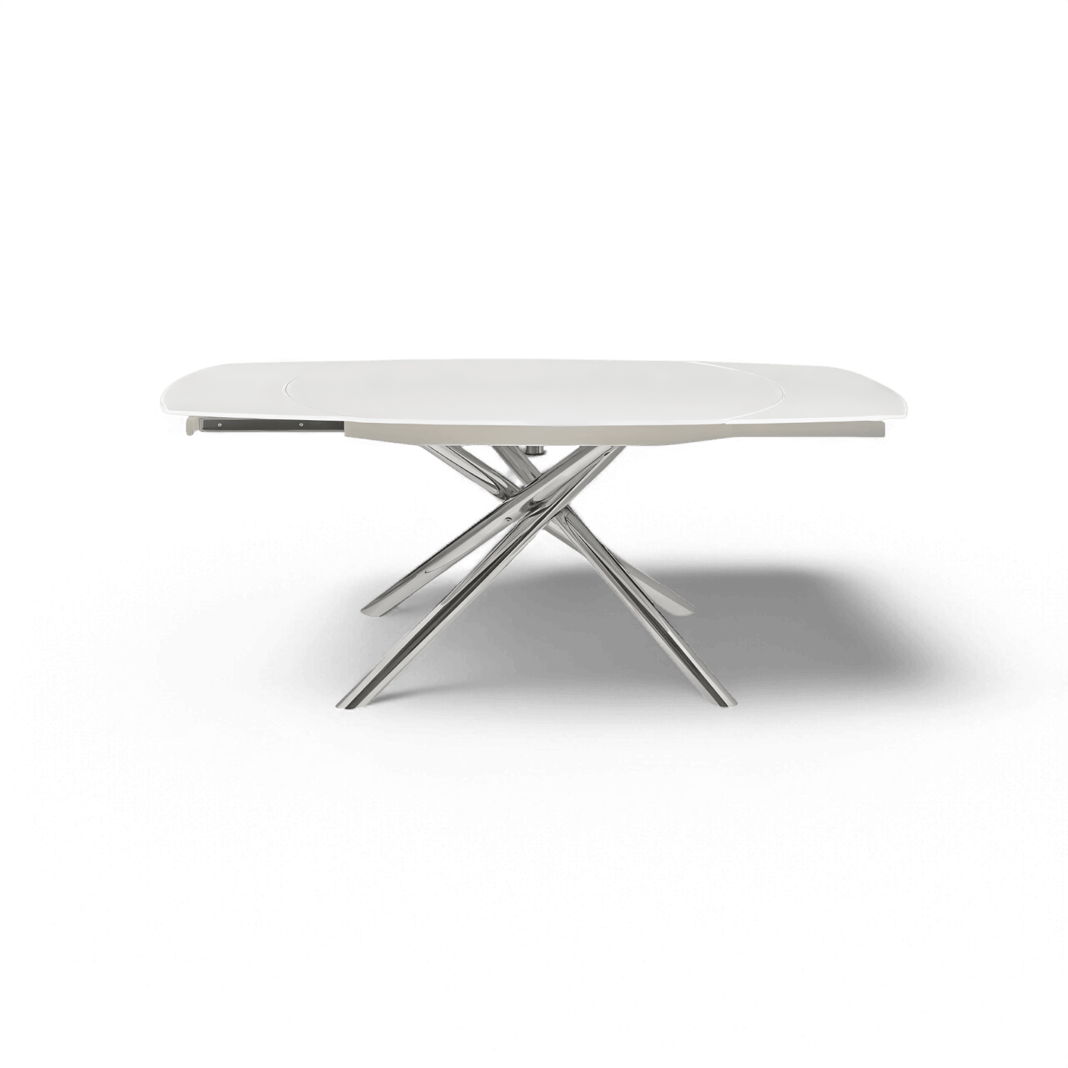 Top: White Painted Back Ultra Clear Glass | White Powder Coated Carbon Steel Top Support (Mechanism) | Legs: Polished Stainless Steel | Weight capacity: 200 lbs | Manually Extendable by a Rotating Mechanism | Seating Capacity: 6