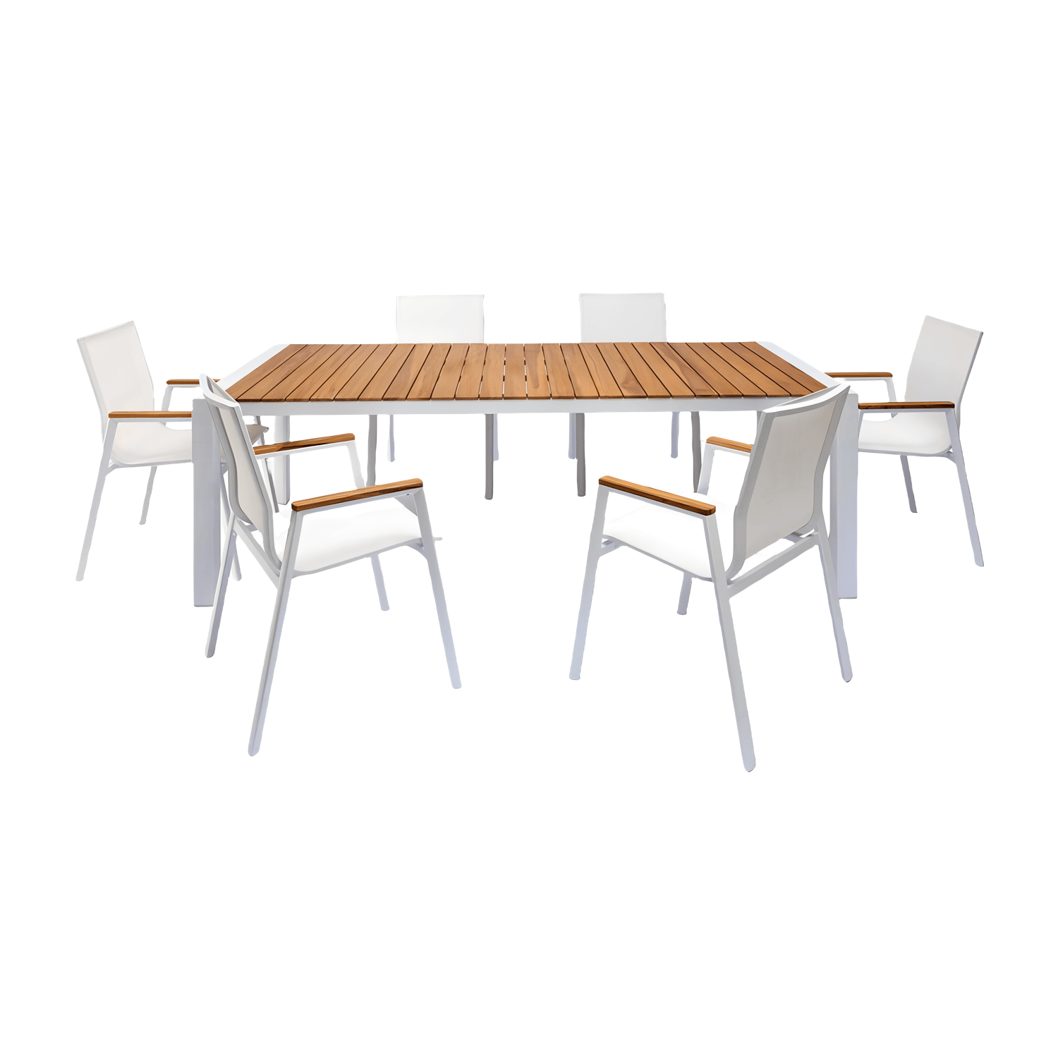 Getting everyone outside just got easier with the Aviana Outdoor Modern Dining Set White. Grab your drinks and food and take the whole family outside to enjoy your backyard with this 7-piece set. Made with functionality in mind, the Aviana Outdoor Modern Dining Set remains pristine through rain or shine with weather resistant material. Pair with the Hatay Modern Umbrella for some shade during sunny summer days.