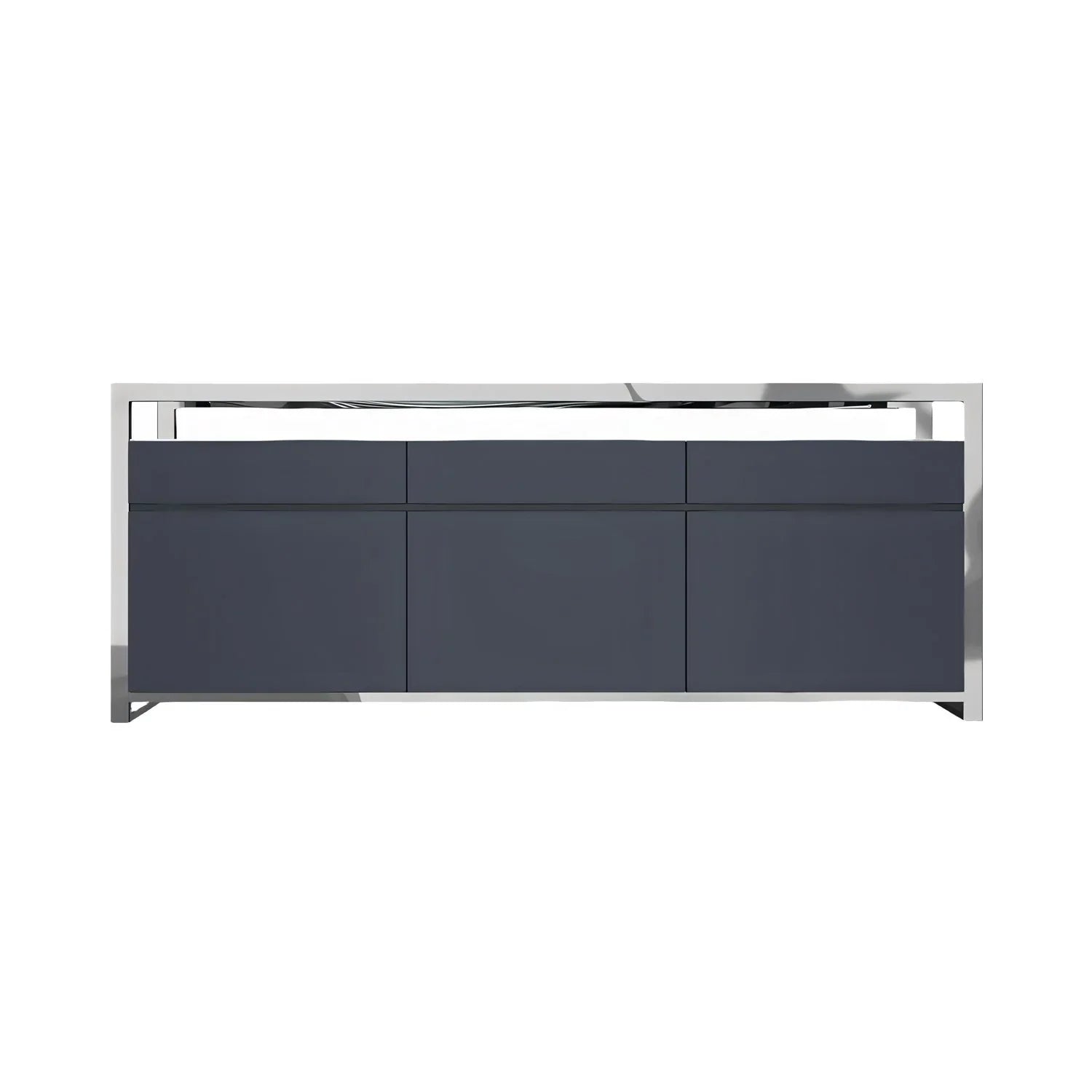 This French-inspired Bari Buffet in Gray will look great in any space with its ample storage areas and sleek features. A stainless-steel frame supports the buffet table for a one of a kind look that is sure to turn heads. Artfully mastering contemporary styling, this buffet table incorporates a minimalistic yet beautiful composition perfect for any modern room. Enjoy the clean look of your dining room while pairing this with stainless steel accents and shiny décor.
