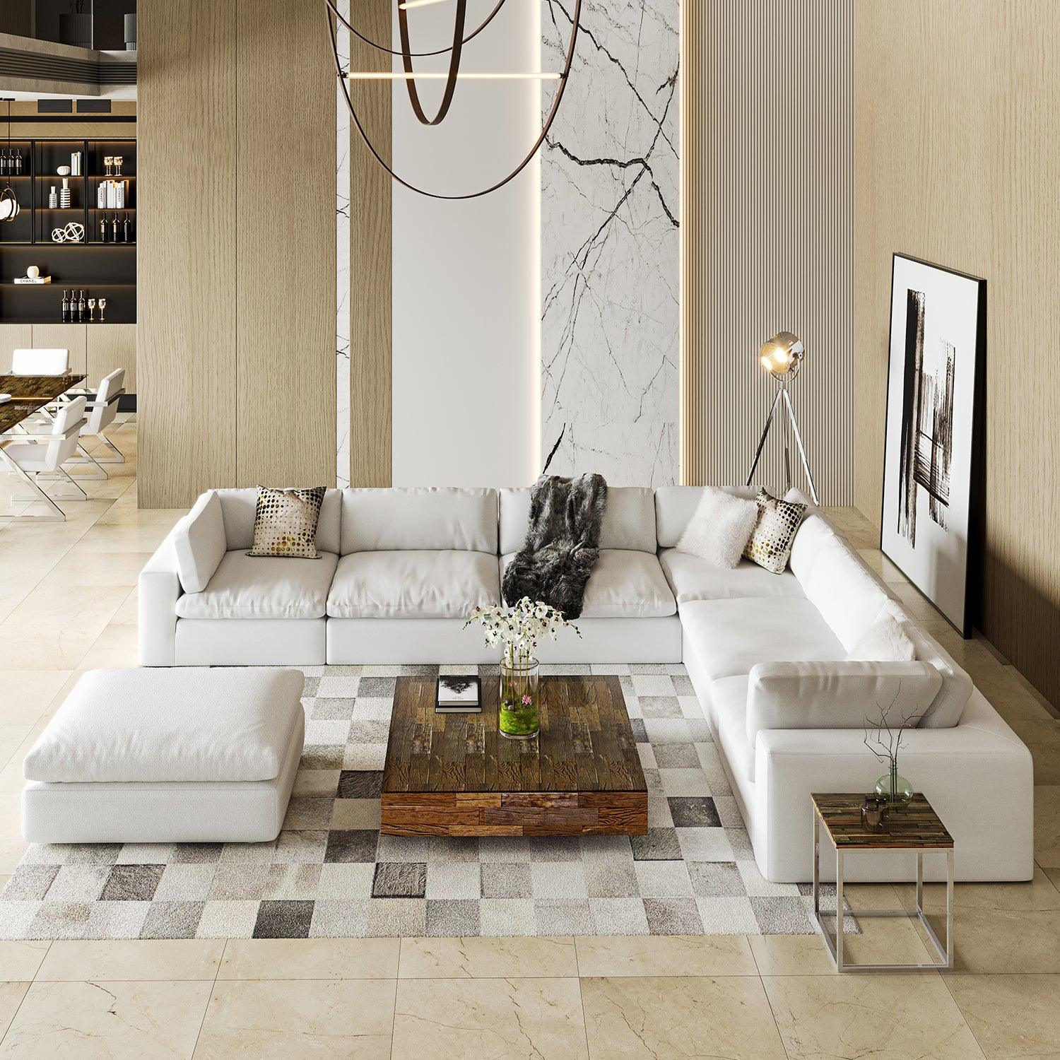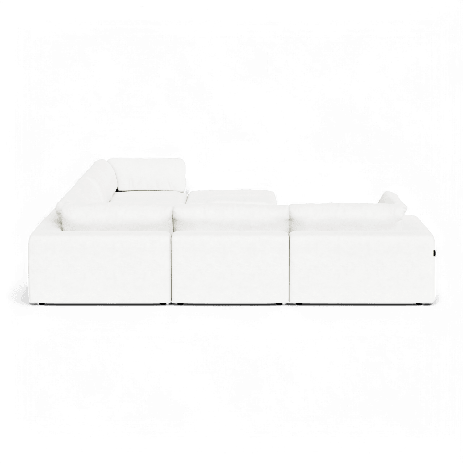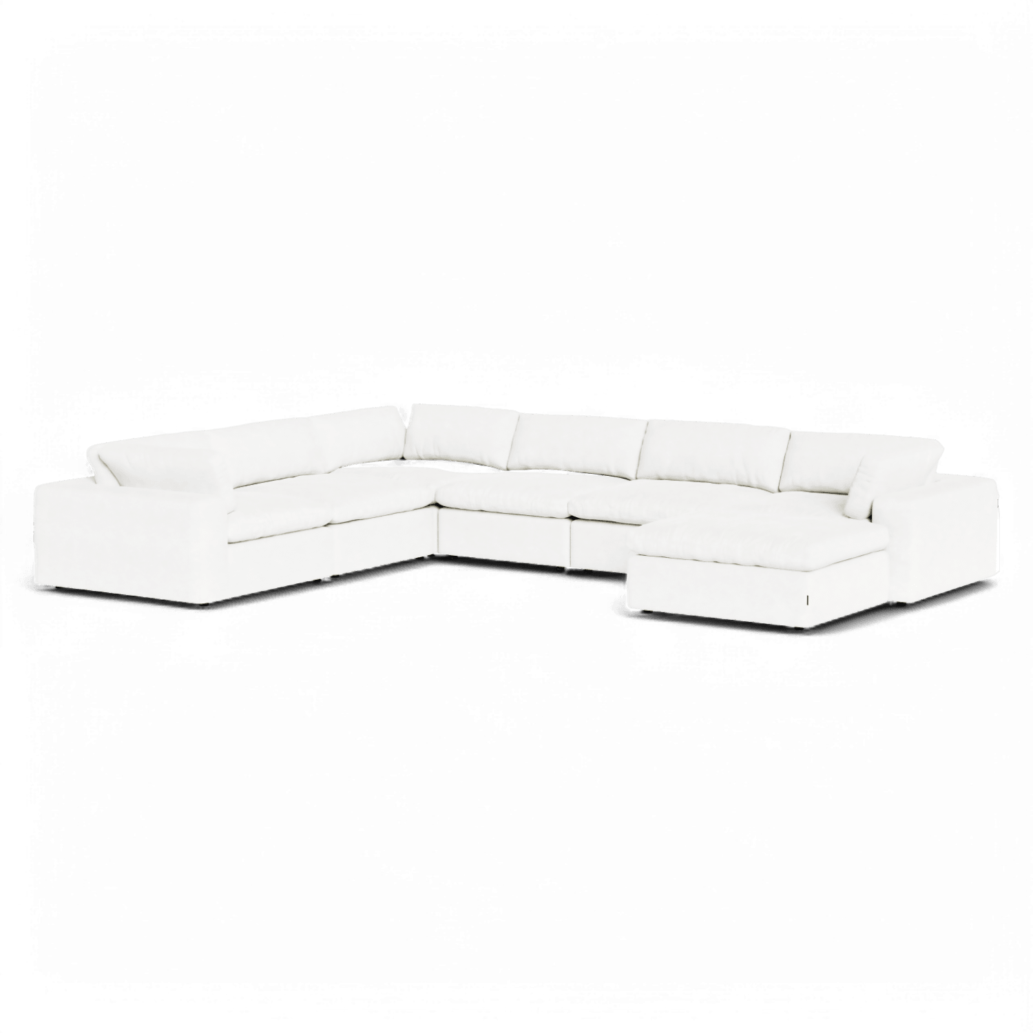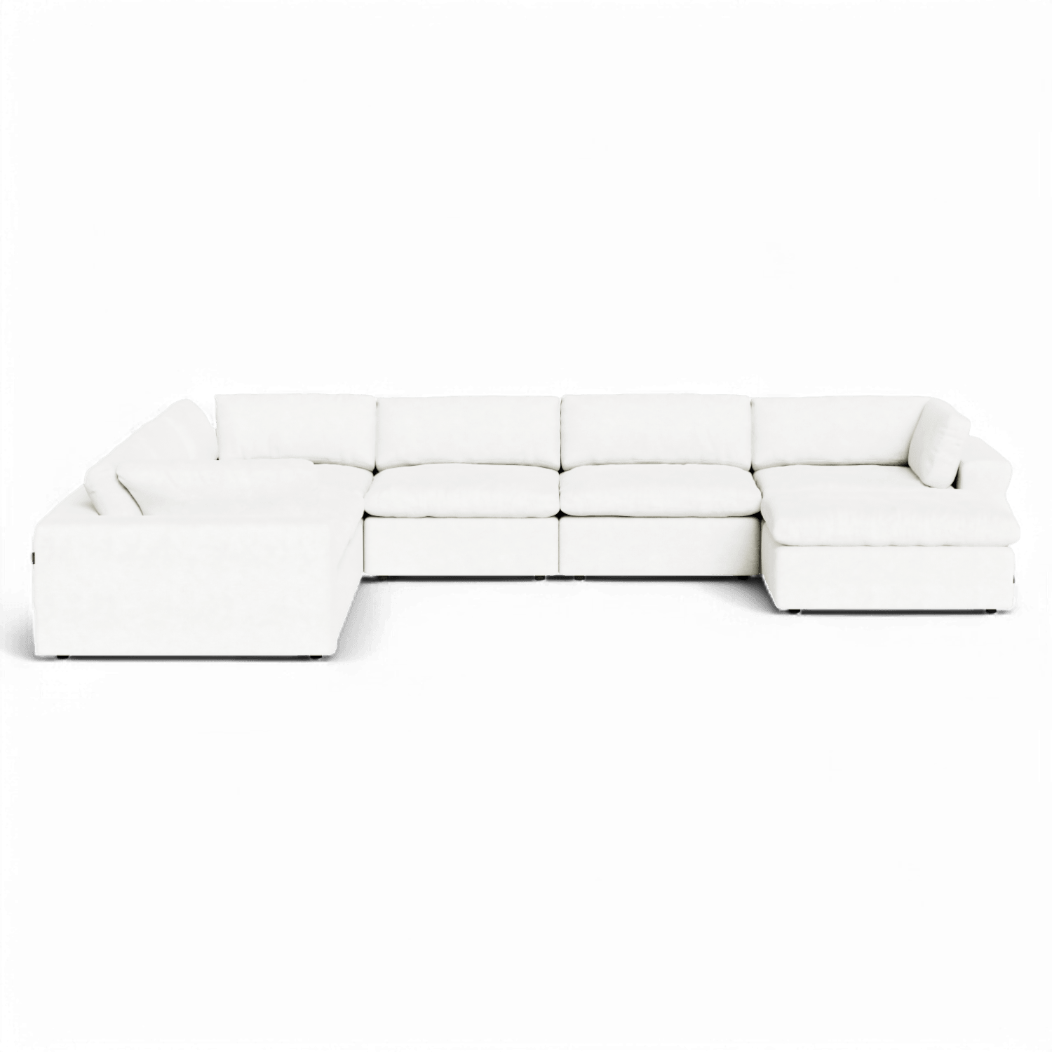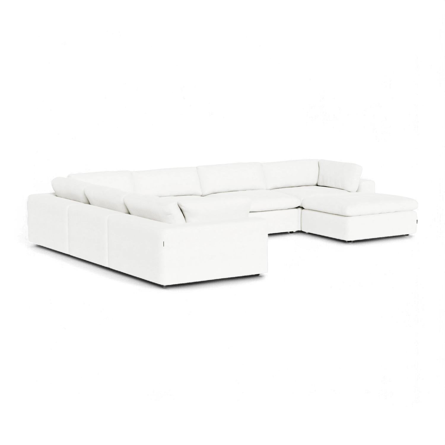 Stretch out in style on the Bloom Extended Sectional Modular Sofa in White. Made for larger rooms, this chic addition offers a generous seating space in a sleek low-lying design with plush cushions that accommodate and elevate. Tailored in stain-resistant smart fabric, this sofa is easy to clean after spills. Duck down seats and cushions are extra plush for full support. The convenient configuration allows you to arrange and rearrange to create the sofa of your dreams. Also available in Light Gray.