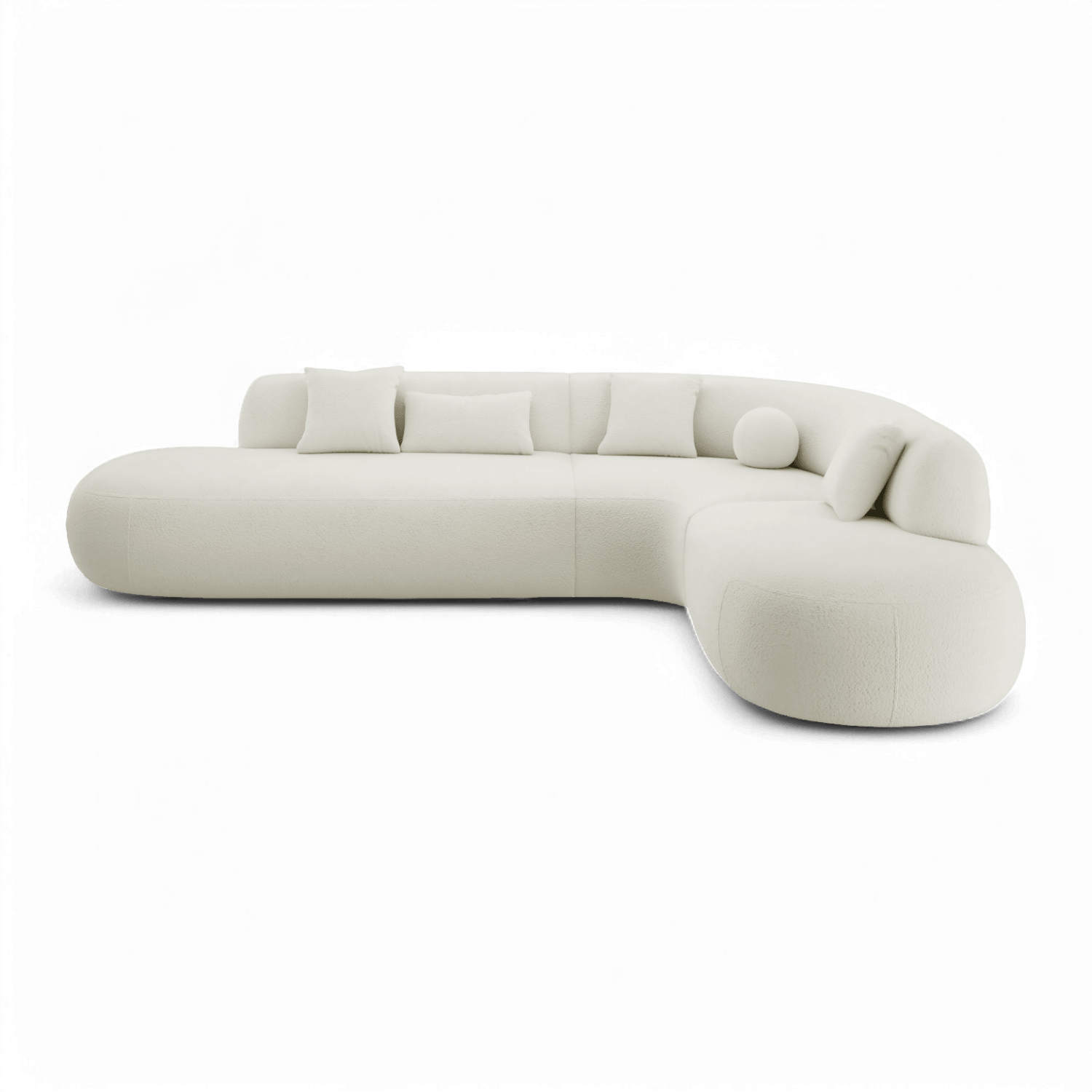 The Boba Sectional Sofa in Ivory Boucle is a stunning centerpiece for modern living spaces, combining minimalist elegance with inviting comfort. Its sleek, contemporary design features gracefully rounded ends create a soft yet sophisticated silhouette. Upholstered in plush ivory boucle fabric, the sofa offers a luxurious texture that complements its clean lines and enhances its cozy appeal. Perfect for lounging or entertaining, the Boba Sectional Sofa effortlessly merges style and functionality, making it a timeless addition to any room.