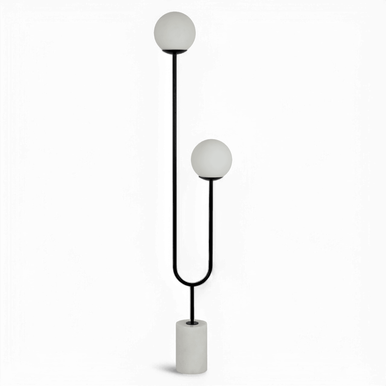 The Brisa Floor Lamp is a sleek, modern lighting fixture standing at an impressive 68 inches tall. This artistic lamp features a minimalist design with two glowing orb-shaped bulbs placed at different heights, adding dynamic visual interest to any space. The black, slender frame gracefully curves in a U-shape, lending an elegant sense of balance and symmetry. The base is a cylindrical piece crafted from white-toned material, providing stability and a subtle contrast to the lamp's darker frame. Ideal for contemporary living rooms, bedrooms, or reading nooks, the Brisa Floor Lamp brings both ambient light and sculptural beauty to your home decor.