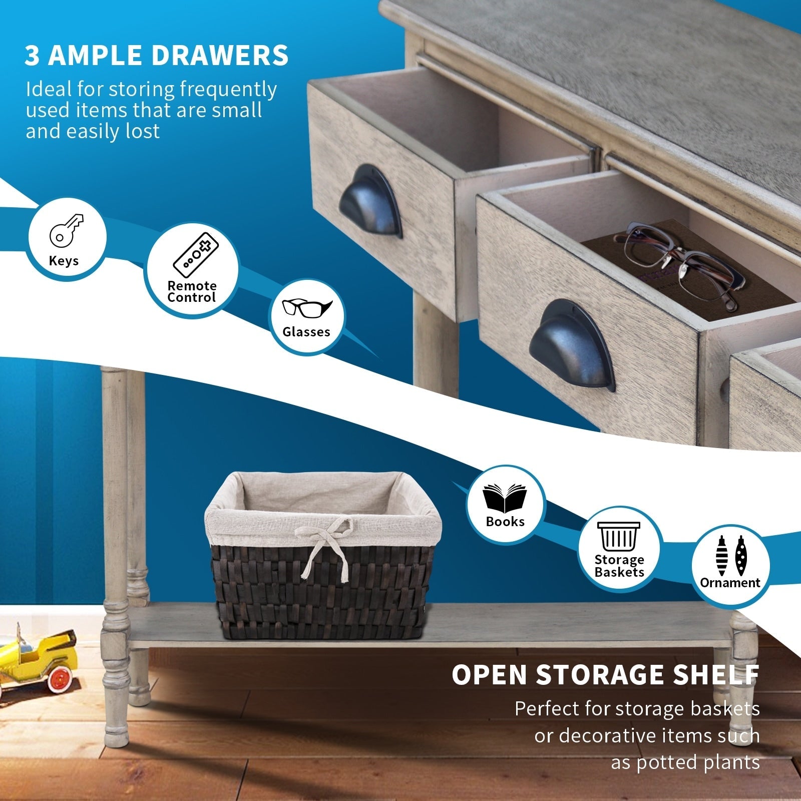 Welcome your guests in style with the Burlington Wood 3-drawer Console Table. This console table boasts a wood frame with intricately carved legs, three drawers, and an open bottom shelf for ample storage and display space. Choose from six versatile finishes to match your existing décor perfectly.