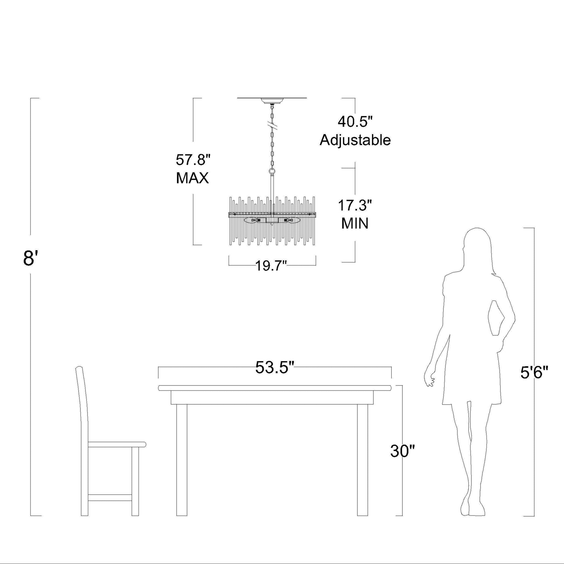 - Max hanging height (from ceiling to the bottom of the light fixture): 57.8 inches, which can be shortened.