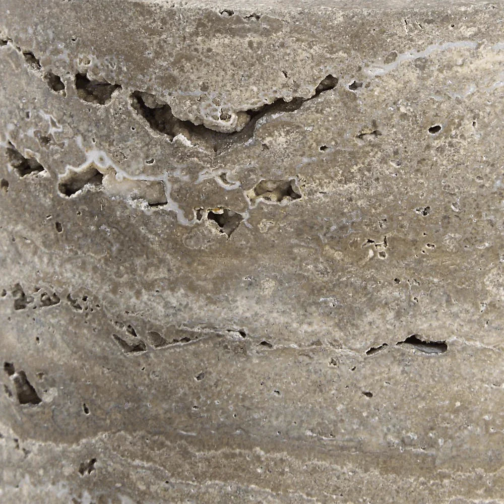 The Cavo Candle Holders are a sophisticated pair of modern decor pieces, expertly crafted from natural stone with a striking marbled pattern in shades of beige, gray, and brown. This set includes a 13-inch high small holder and a 16-inch high large holder, both featuring a design with a 4-inch diameter, complemented by a polished metallic ring for a refined touch. Designed to hold a standard pillar candle (not included), these holders add a warm, organic elegance to any mantel, table, or shelf, making them perfect for creating an inviting ambiance in contemporary or rustic interiors.