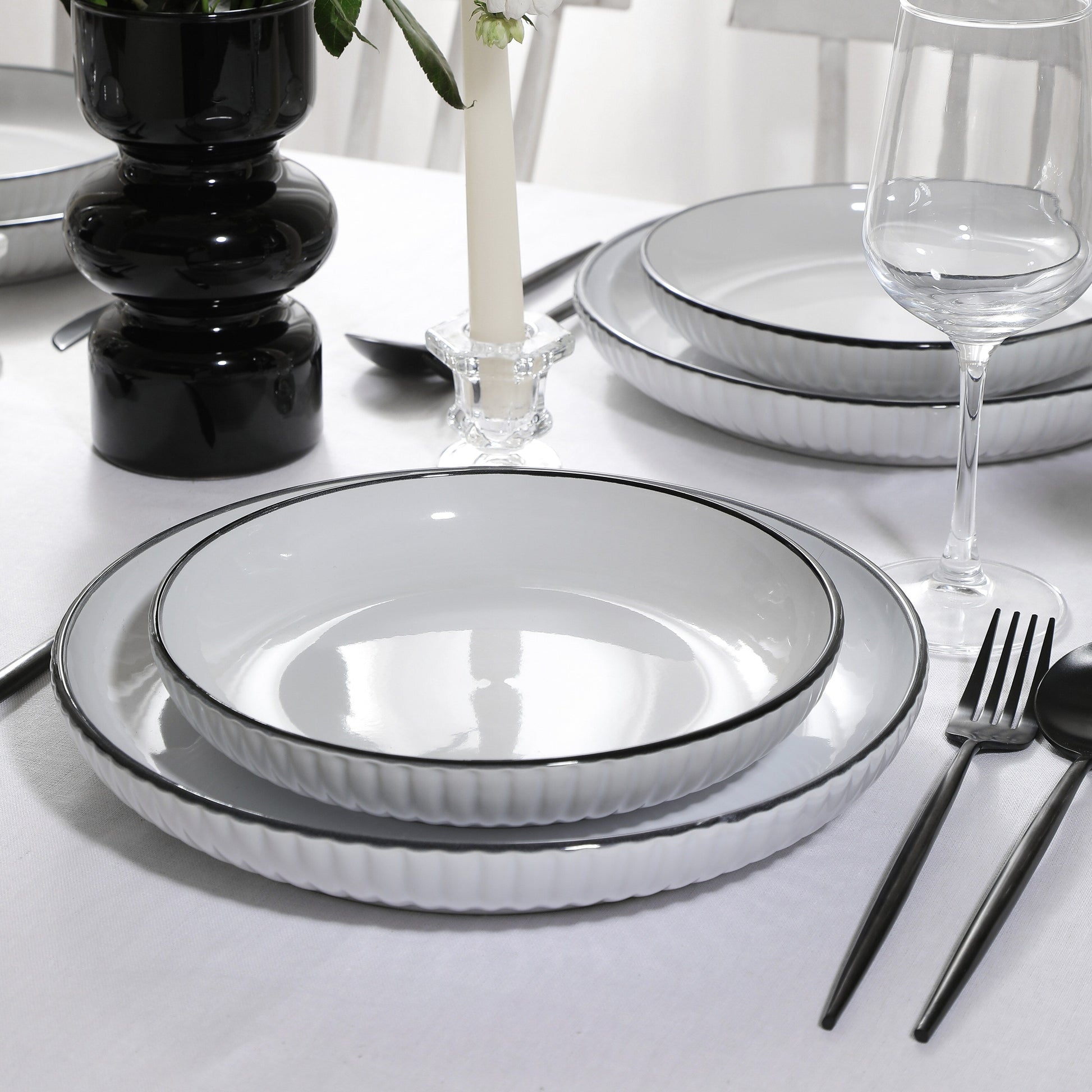 - White-Black Rim: The white stoneware is classic, while the thin black rim adds a dash of intrigue and visual interest.