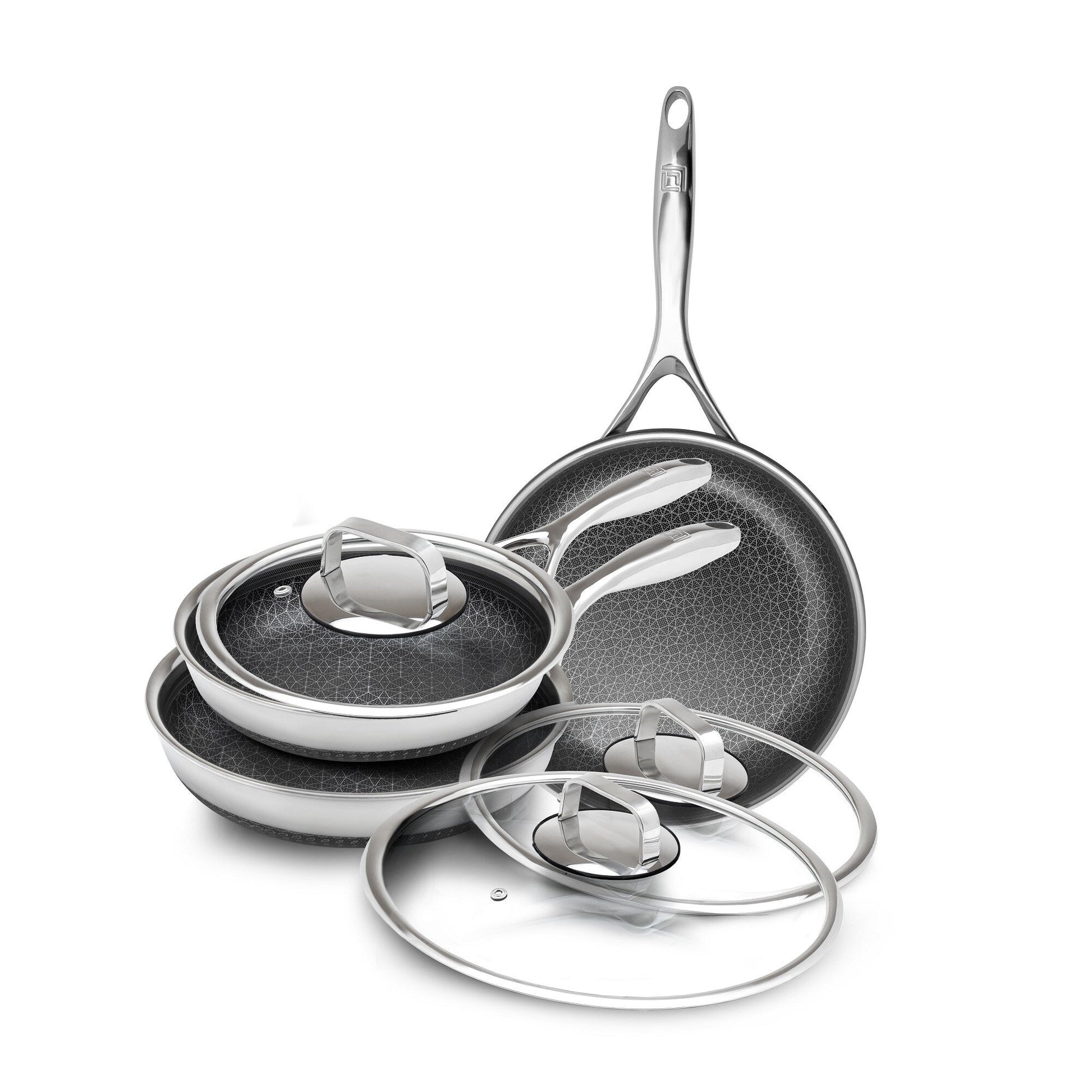 - 6-Piece Set: Includes 8', 10', and 12' Hybrid Fry Pans with matching Tempered Glass Lids.