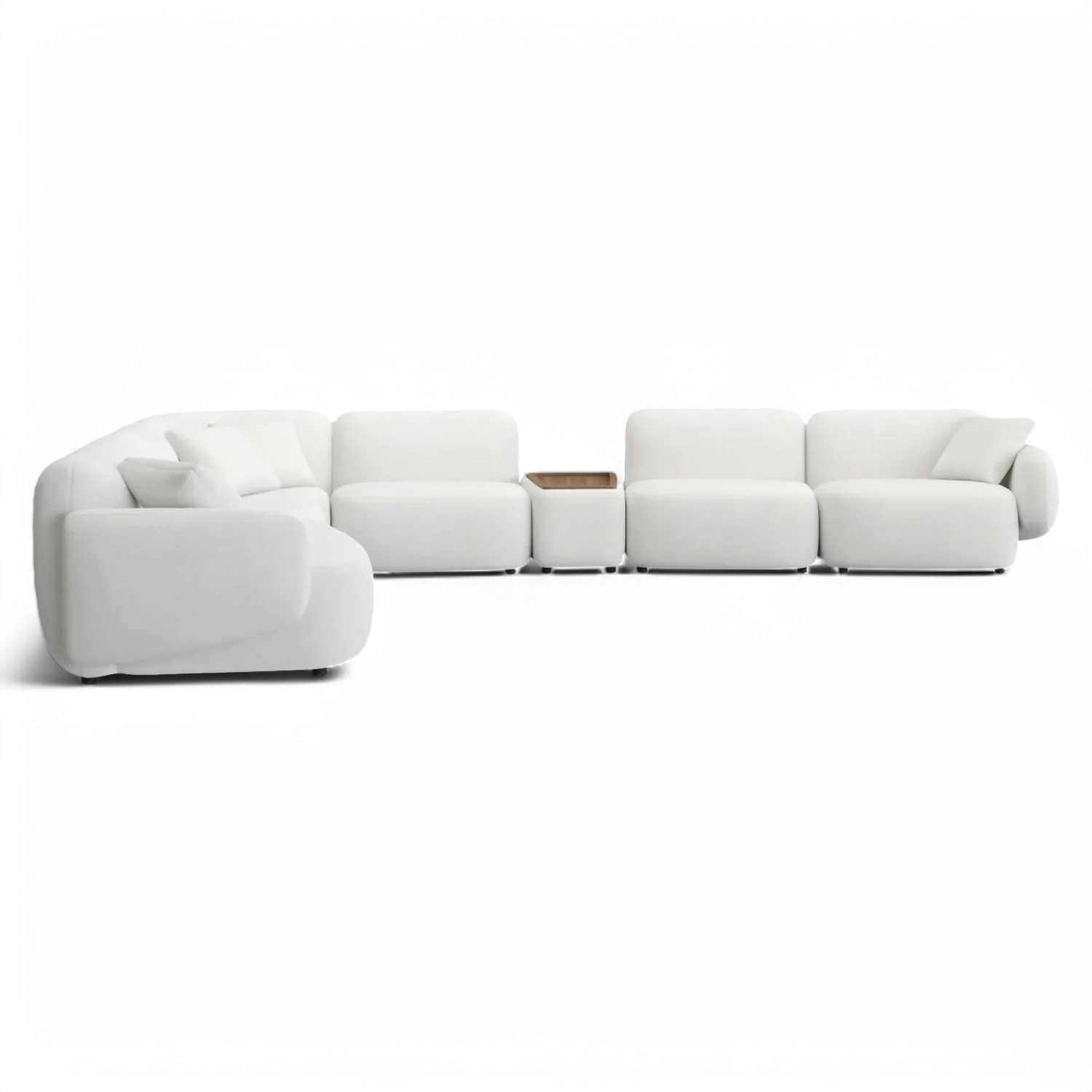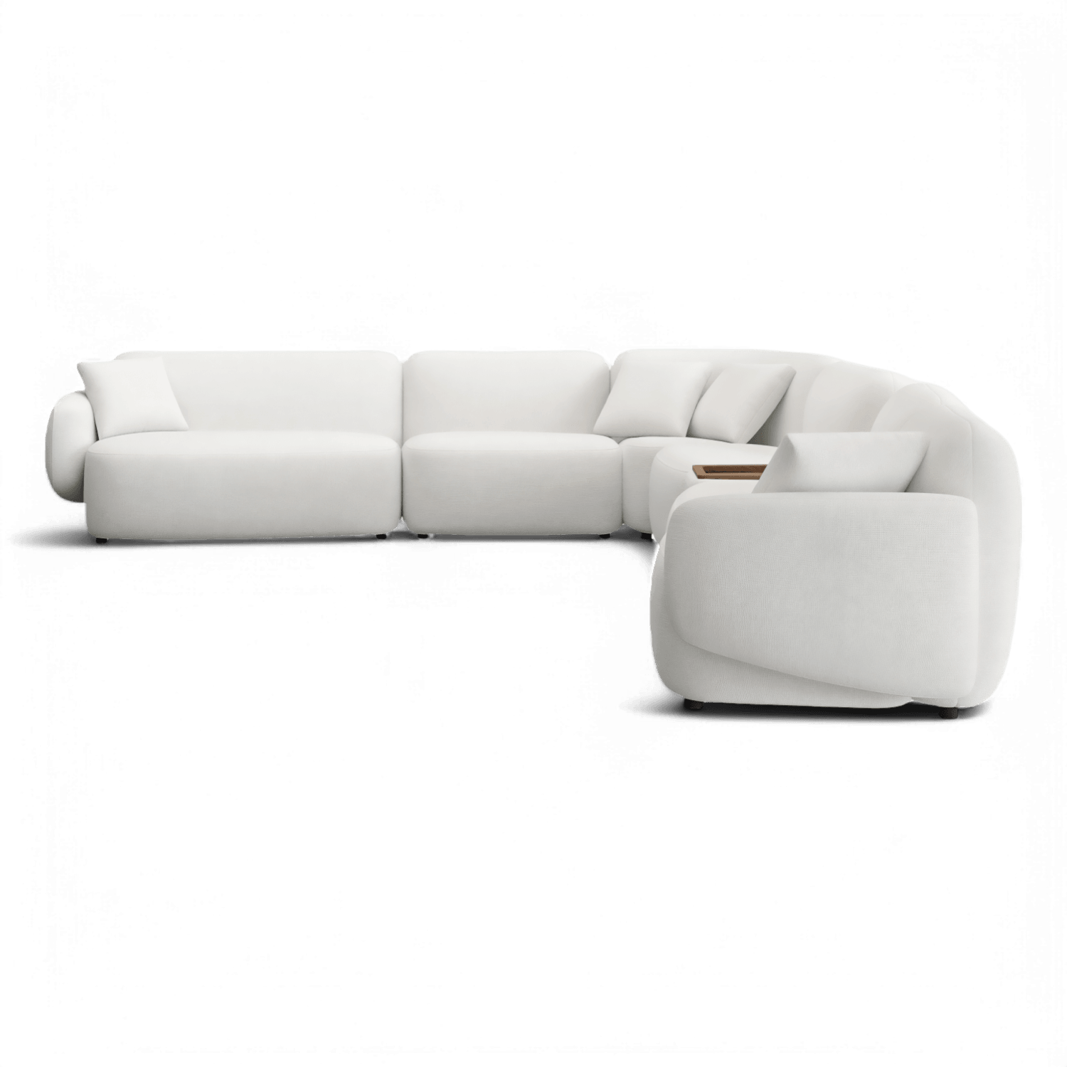 The Divano Sectional Set in Off White combines modern elegance with practical functionality. Its rounded L-shaped design and soft, curved edges create a sleek yet inviting aesthetic that complements a variety of interior styles. Upholstered in a luxurious off white fabric, this sectional exudes a clean and sophisticated look. A standout feature is its integrated console section. It's designed to double as a padded armrest with inside storage; or flip it for a convenient tabletop - perfect for placing drinks, snacks, or decor. With its blend of style, comfort, and utility, the Divano Sectional Set in Off White is an ideal centerpiece for any living room, providing ample seating for relaxation or entertaining guests.