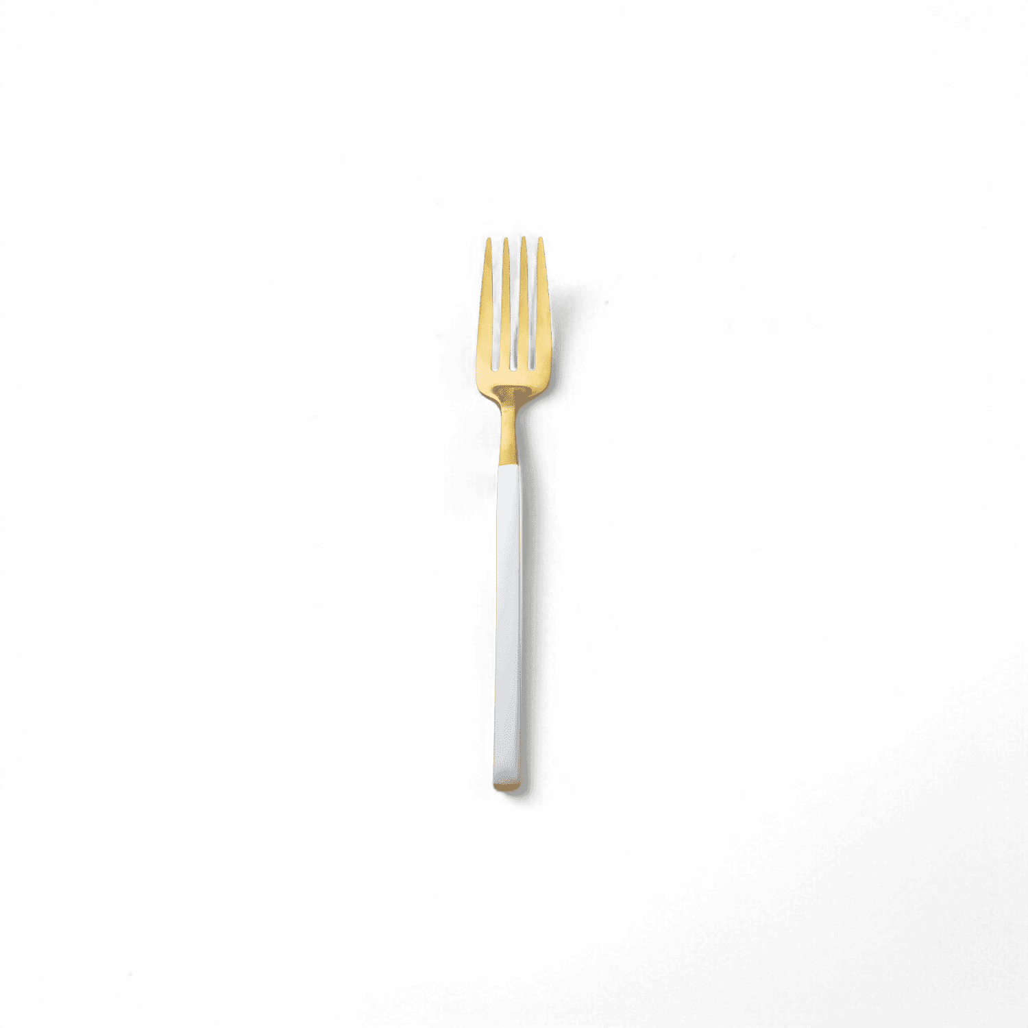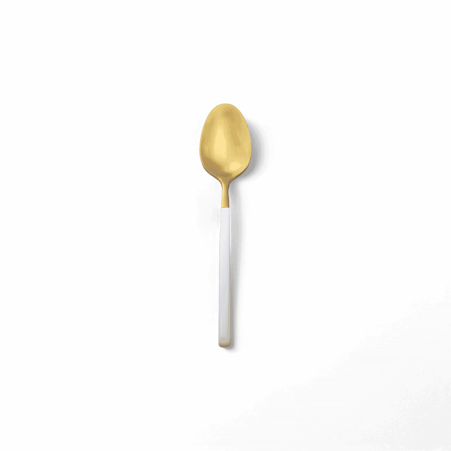 Slender cube-like profile captivates the eye and allows for a firm grip. A dual contrast of gold and white add a chic flair to the dining table. Crafted in stainless steel and chromium nickel, the Dolomity White and Gold Silverware Set includes 1 fork, 1 knife, 1 large spoon and 1 small spoon. Ideal for fancy dinners and casual every day meals, this set is an asset to the table.