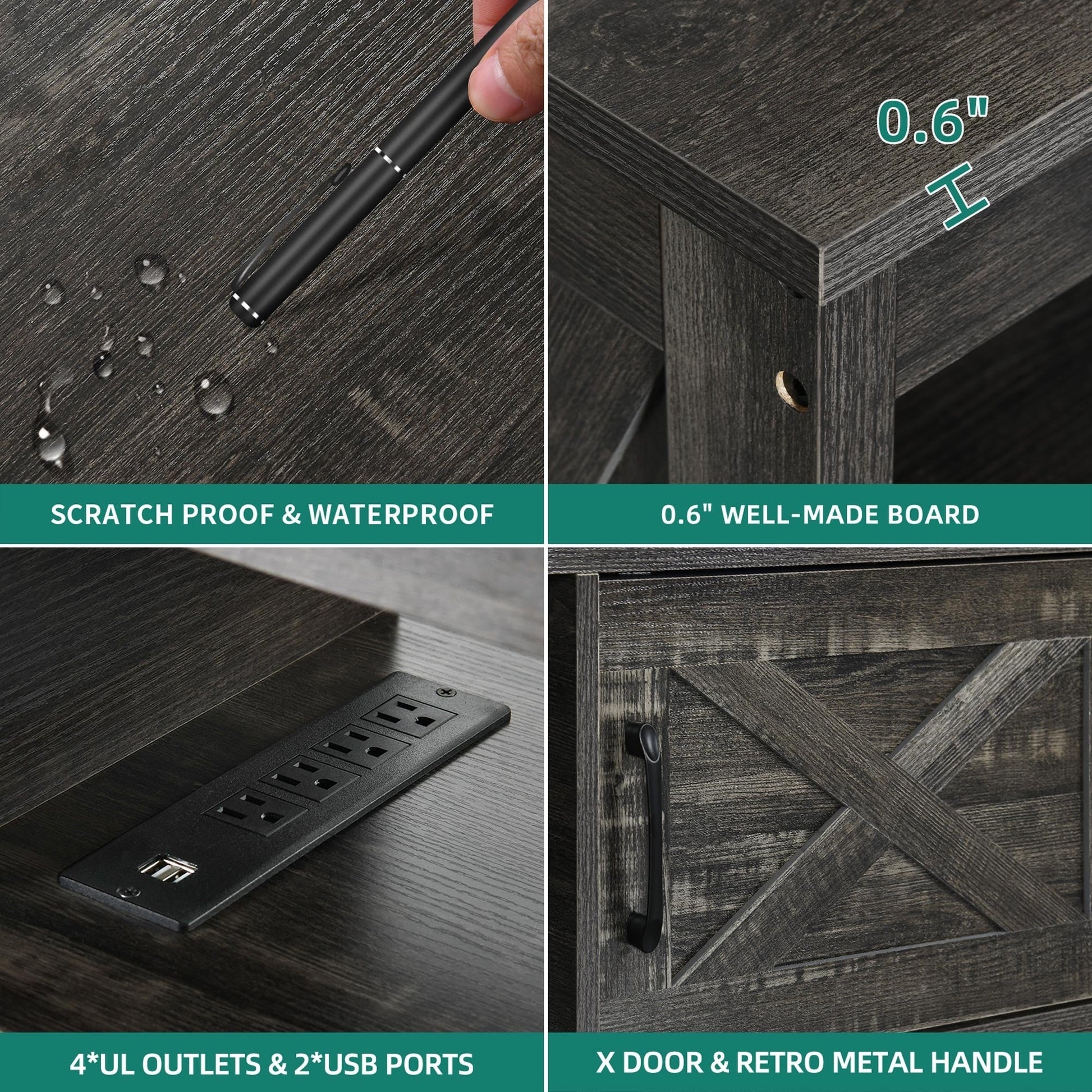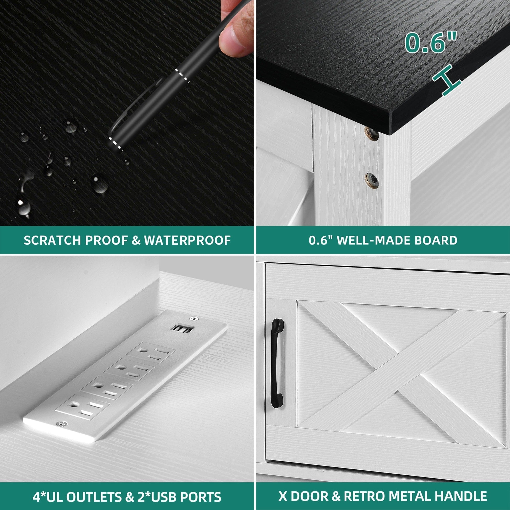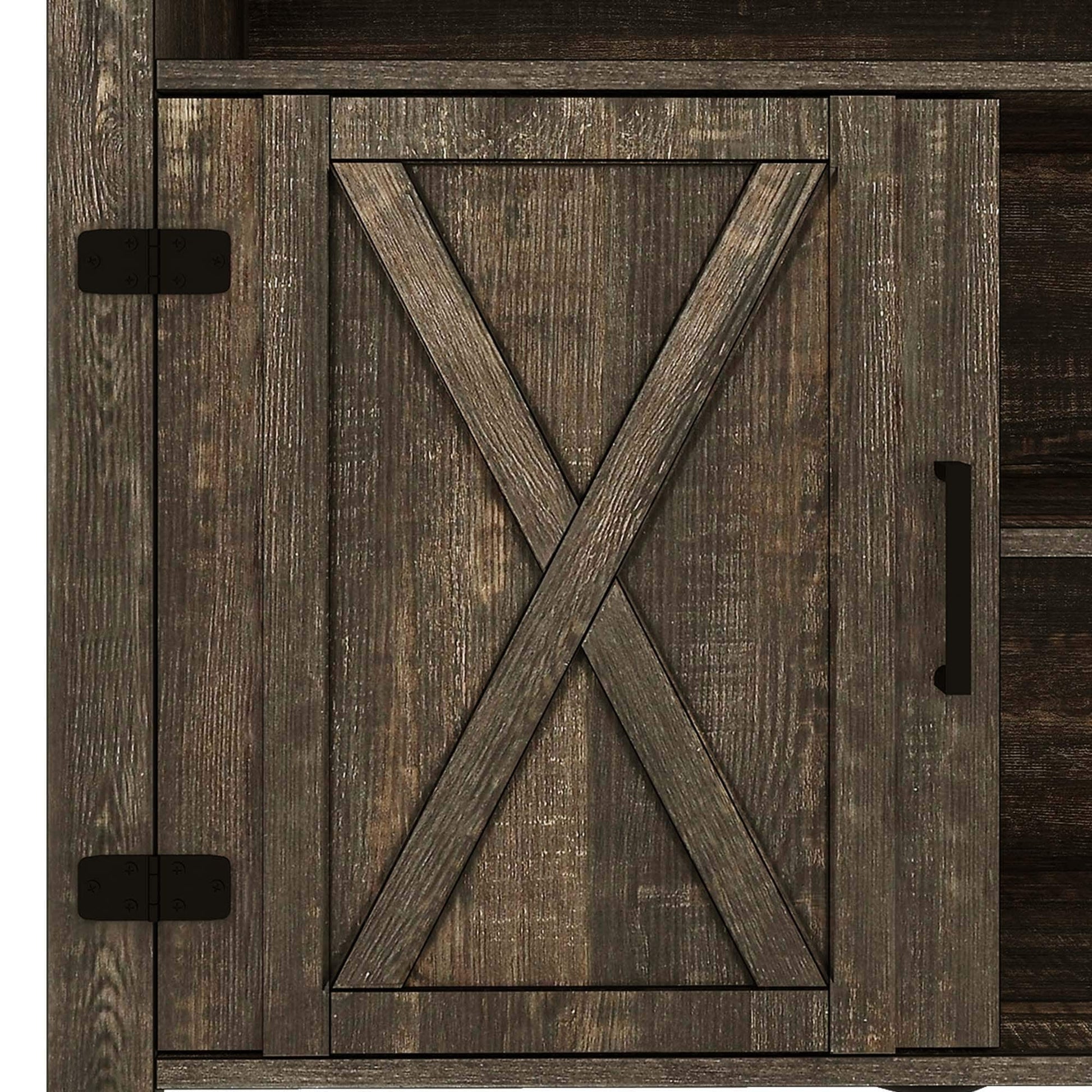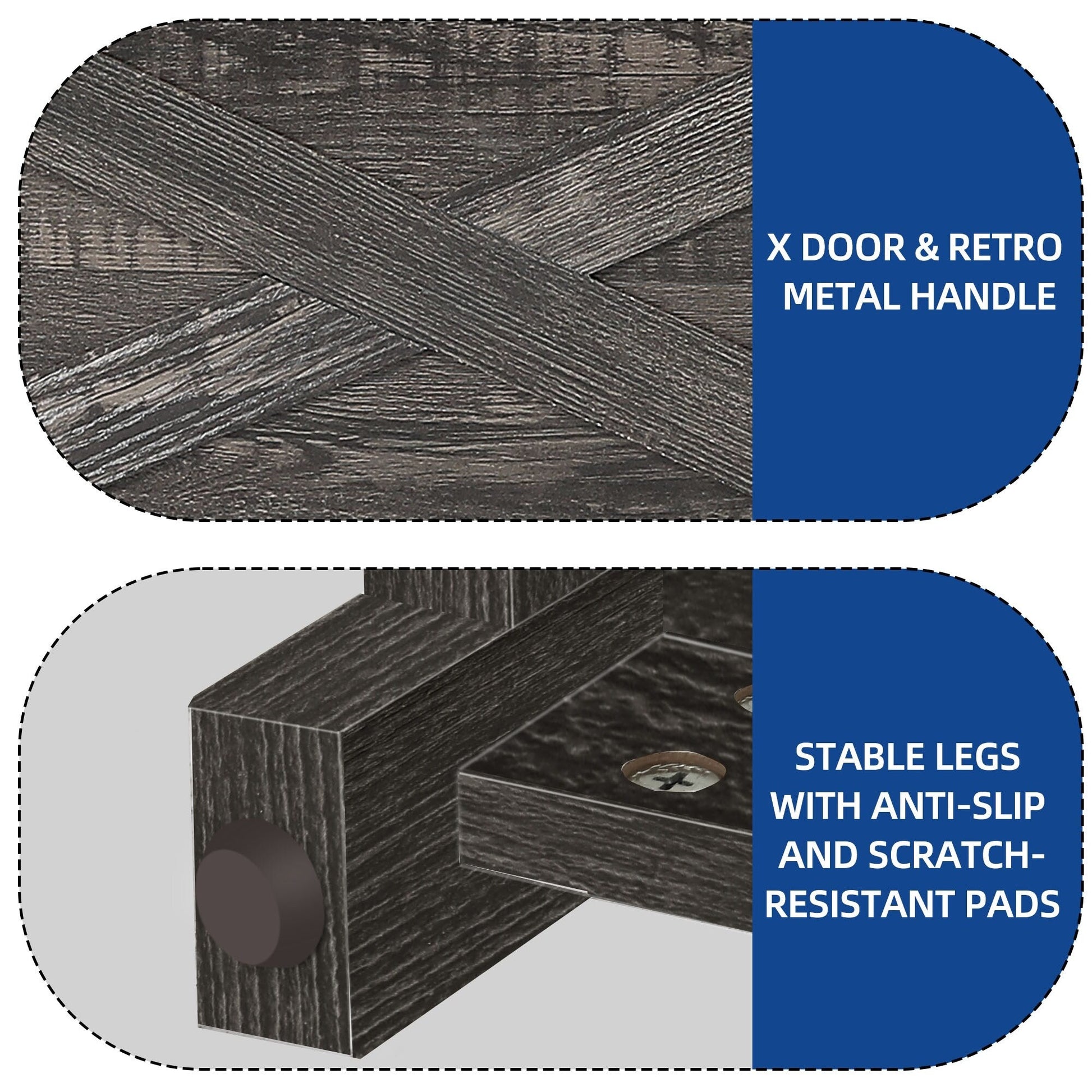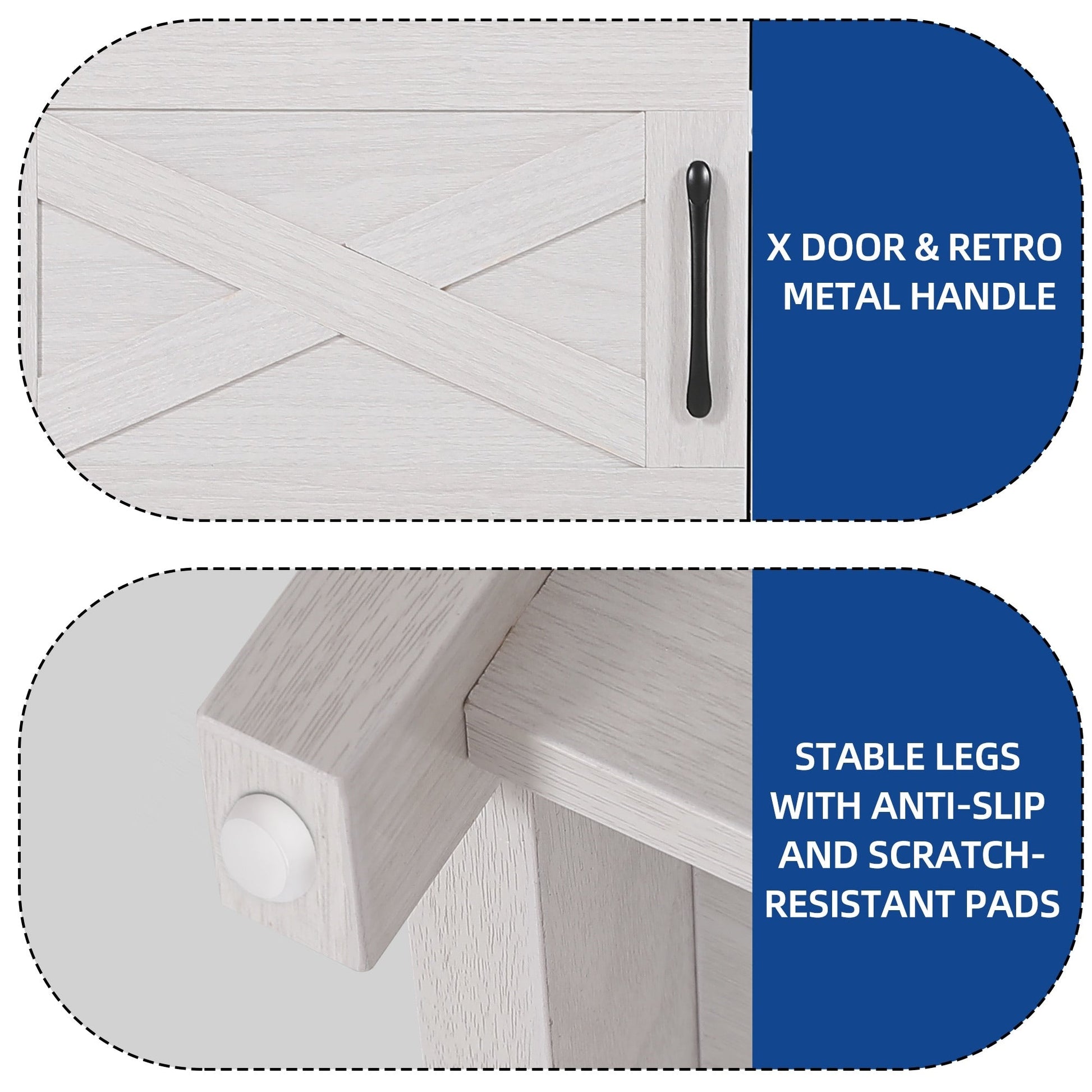 - 1. Double X Design: Classic X design on both sides upgraded the decoration style. Easy steel bar handles hinge doors put things in and out conveniently without wobbling or scraping