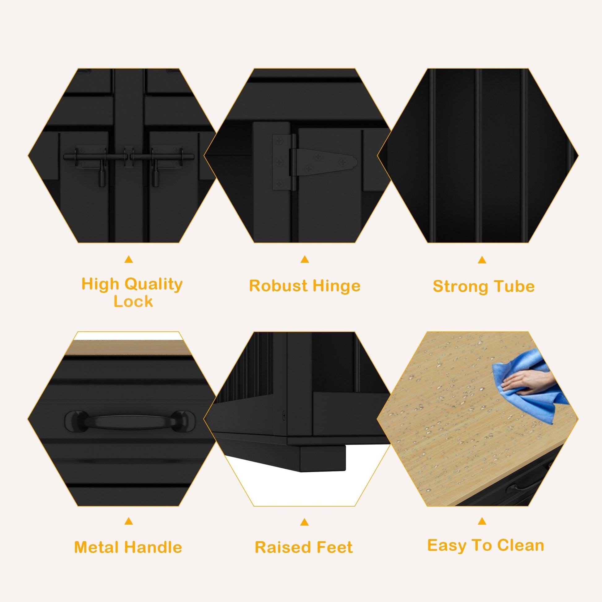 ●【THOUGHTFUL DETAIL DESIGN】Dog crate has iron bars to keep your animal contained, while also letting them watch the action around the household and allowing you to watch dog's condition. 2 door latches keep dogs from messing around run. The black sticker can hide the screw to be more beautiful. Felt feet pads can increase the friction with the ground to prevent slipping and scratching the floor.