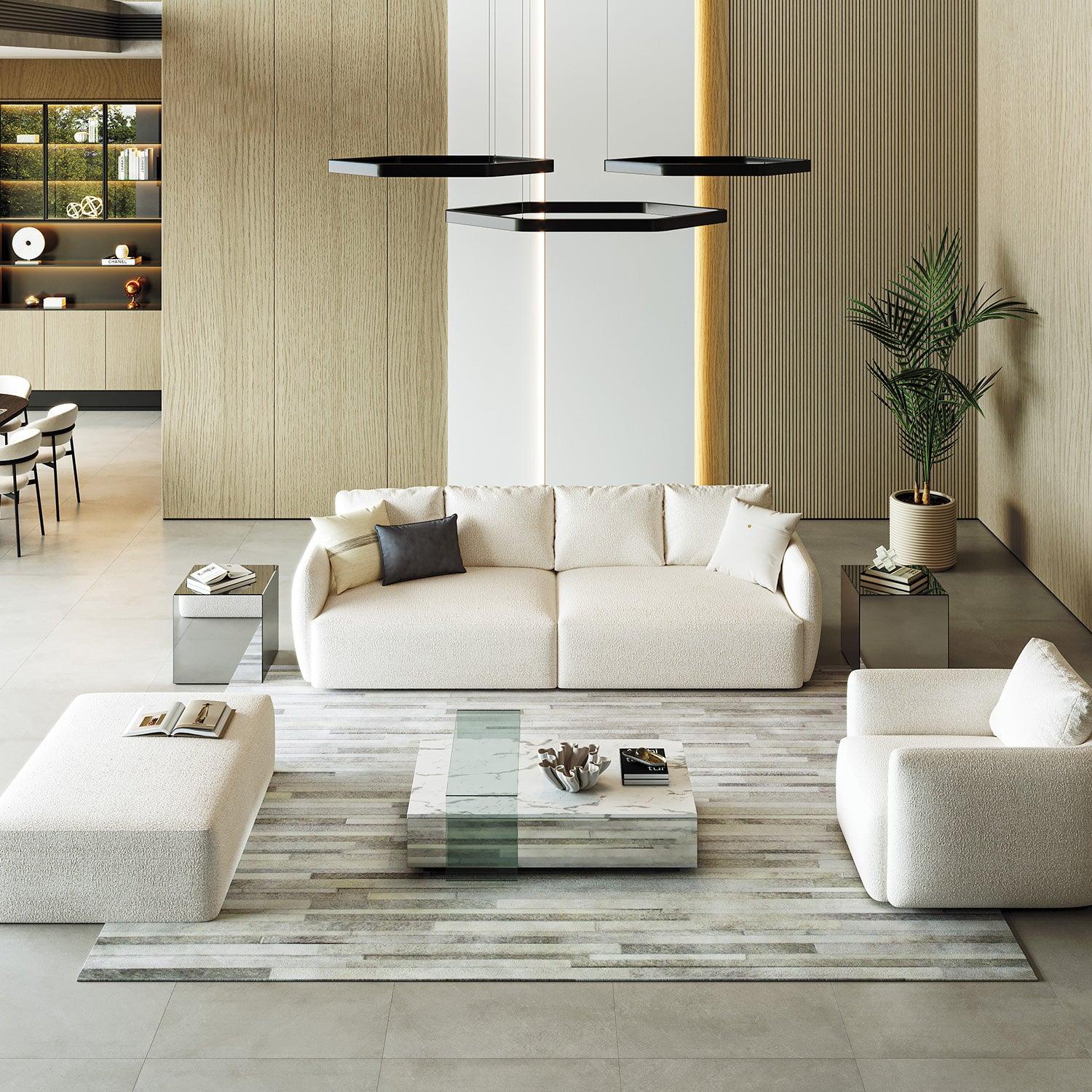 Introducing the exquisite Gabriele Ottoman in White Boucle, a perfect companion to the Gabriele Sofa, designed to elevate your living space with its unparalleled blend of comfort, elegance, and contemporary style. The Gabriele Ottoman boasts soft curves that seamlessly harmonize with the Gabriele Sofa's aesthetic, creating a cohesive and inviting ambiance in any room.