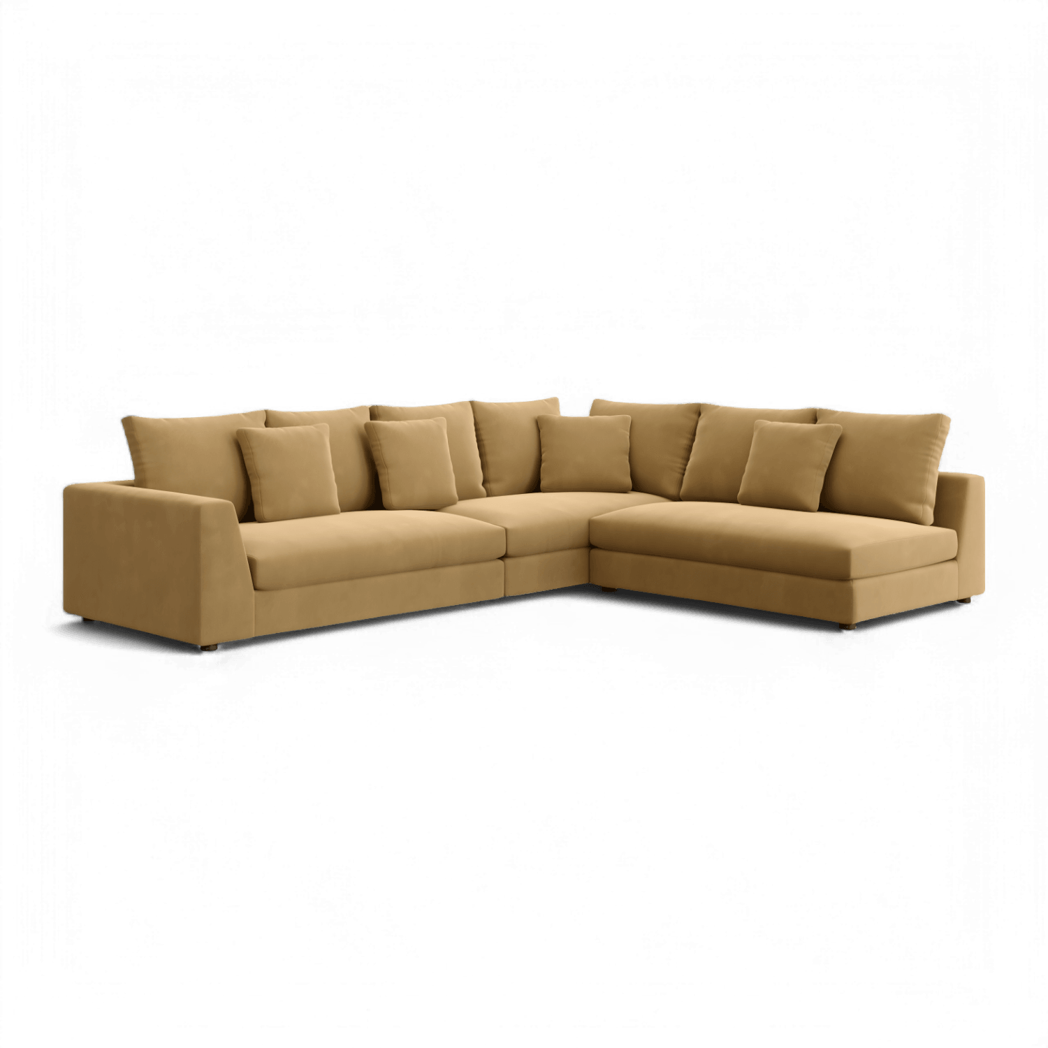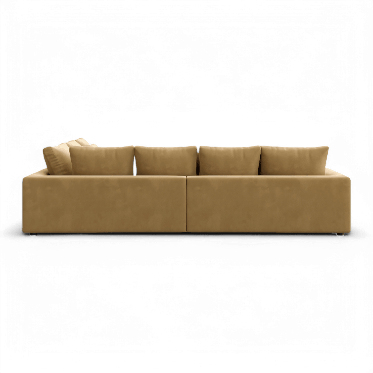 Designed with a squared armrest and a sleek back, the Gianni sofa exudes contemporary elegance while providing ample support. Generously sized back pillows and four matching throw pillows enhance its comfort, making it the perfect place to unwind after a long day. Whether you're entertaining guests or enjoying quiet evenings at home, the Gianni Sectional Sofa Camel Velvet delivers style and relaxation in equal measure.