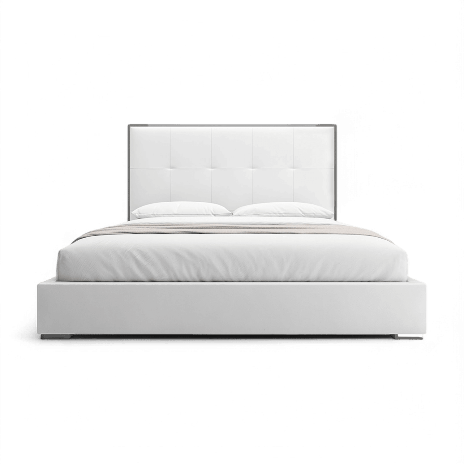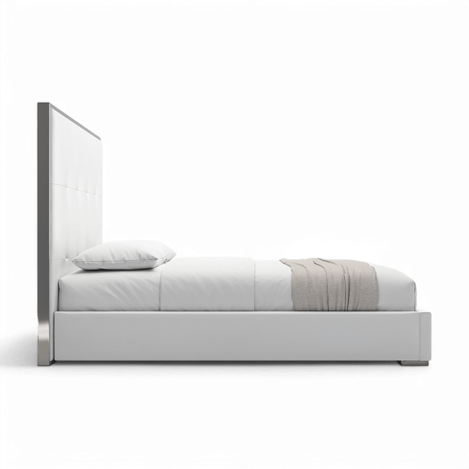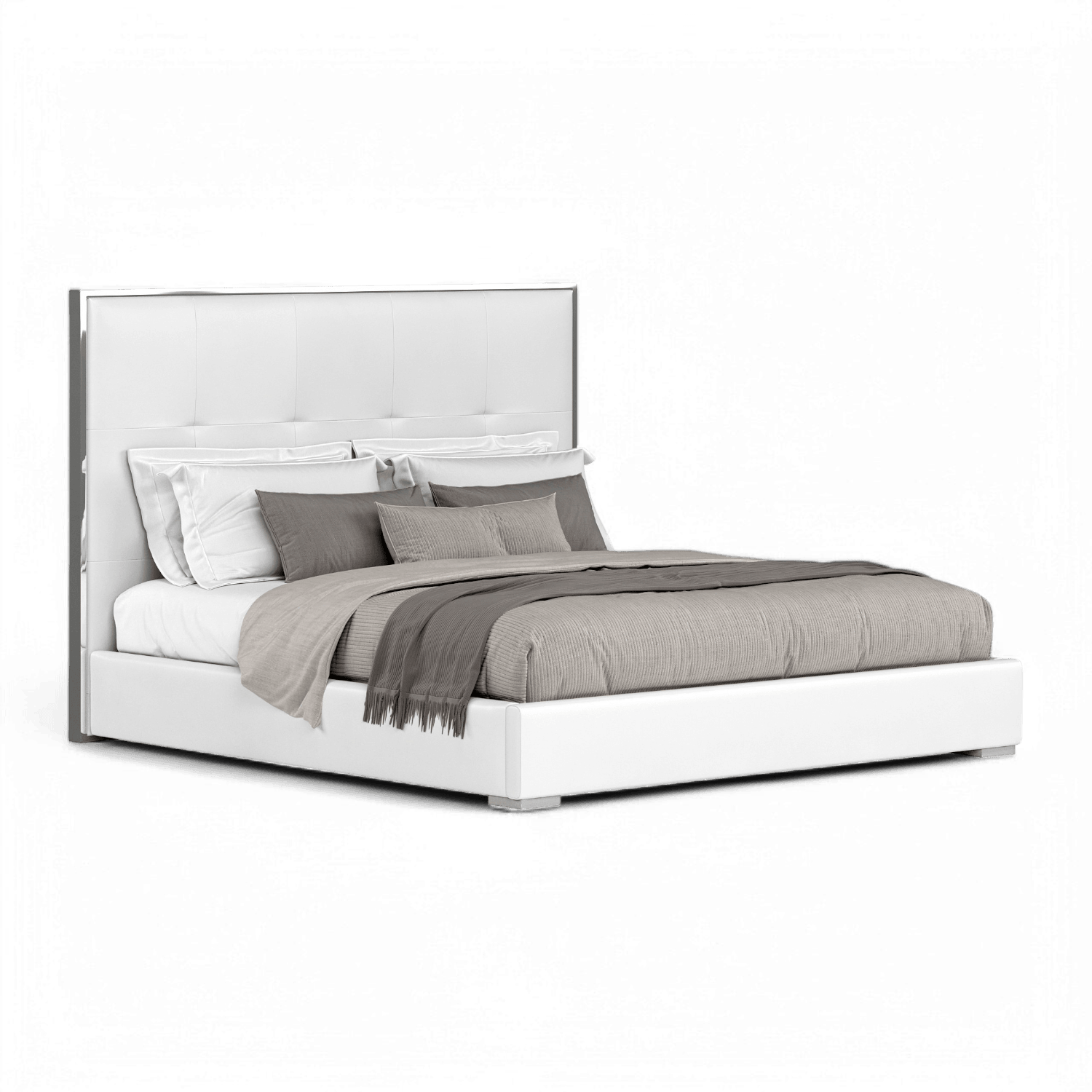 White Eco-Leather Upholstery | Polished Stainless Steel Headboard Frame | Engineered Wood Inner Frame | Wooden Slats Base | Weight capacity: 1100 lbs