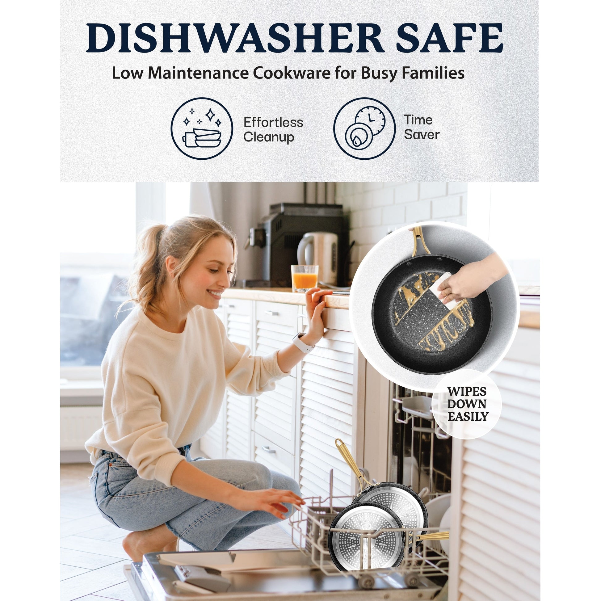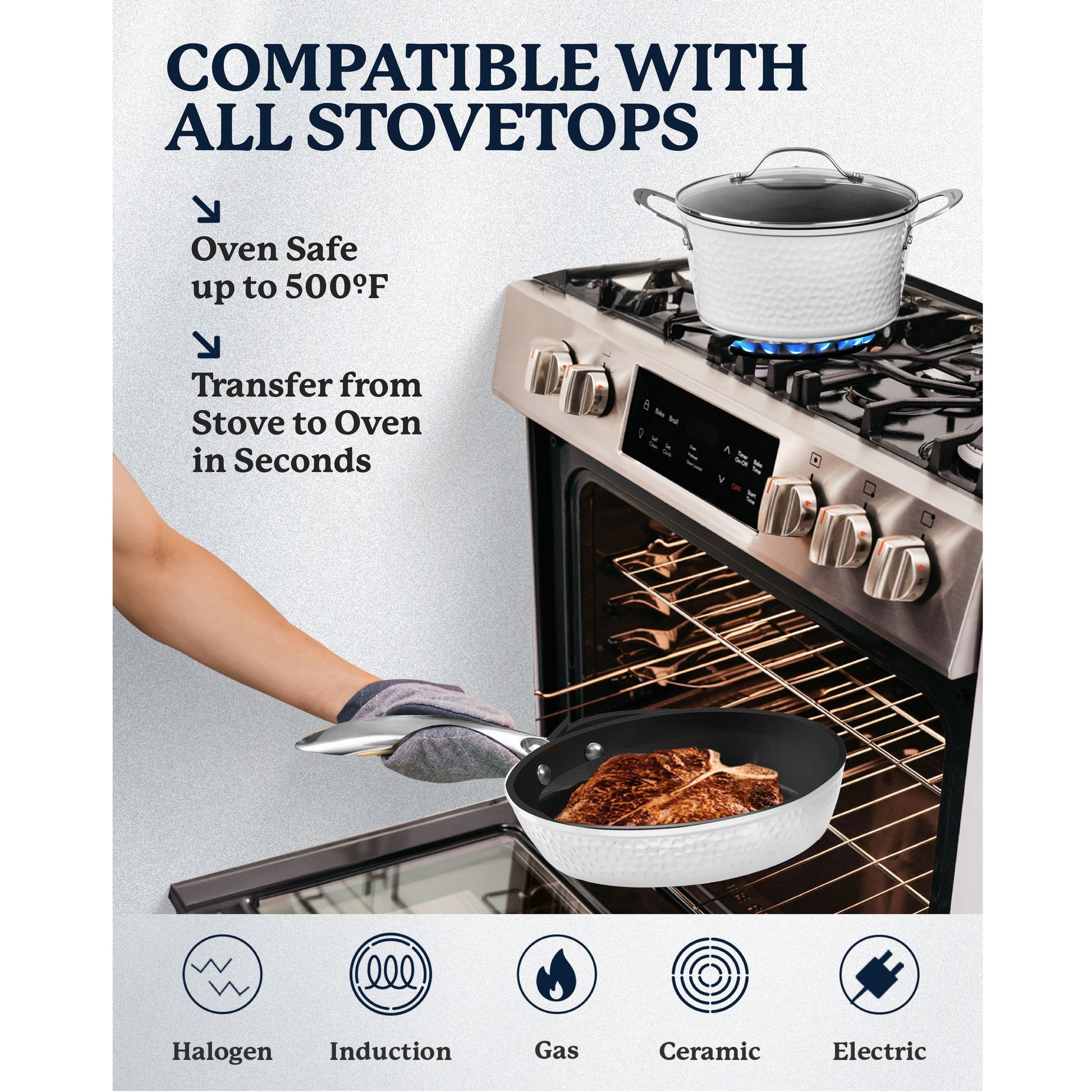 Reimagine weeknight dinners with the 10x longer lasting and ultra durable Granitestone Charleston cookware set. The 15-piece set includes a 8' fry pan, 10' fry pan with lid, 1.5-quart saucepan with lid, 2.5-quart saucepan with lid, 5-quart stock pot with lid, stainless steel steamer basket, and 5-piece utensil set. Crafted with three layers of exceptional durability with a coating that lasts 10x as long as conventional ones, this pot and pan set was made to handle your daily kitchen routines. Its nonstick surface ensures that food effortlessly glides off, while remaining easy to clean. Little to no oil or butter is needed and every piece is made without PFOA, PFOS, lead, or cadmium so they're crafted for healthier cooking goals. A dishwasher safe design that's metal-utensil safe and scratch-resistant makes cooking and cleaning a whole lot easier. Each piece has an induction base and is oven safe up to 500˚F so you can cook any way you want. Gold ergonomic handles stay cool to the touch to offer maximum comfort while cooking. To top it off, it has a modern farmhouse look with a hammered design that brings elegance and durability together.