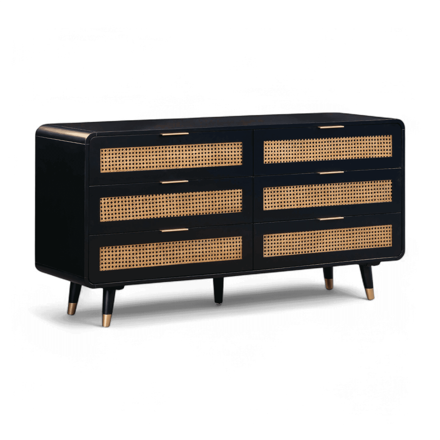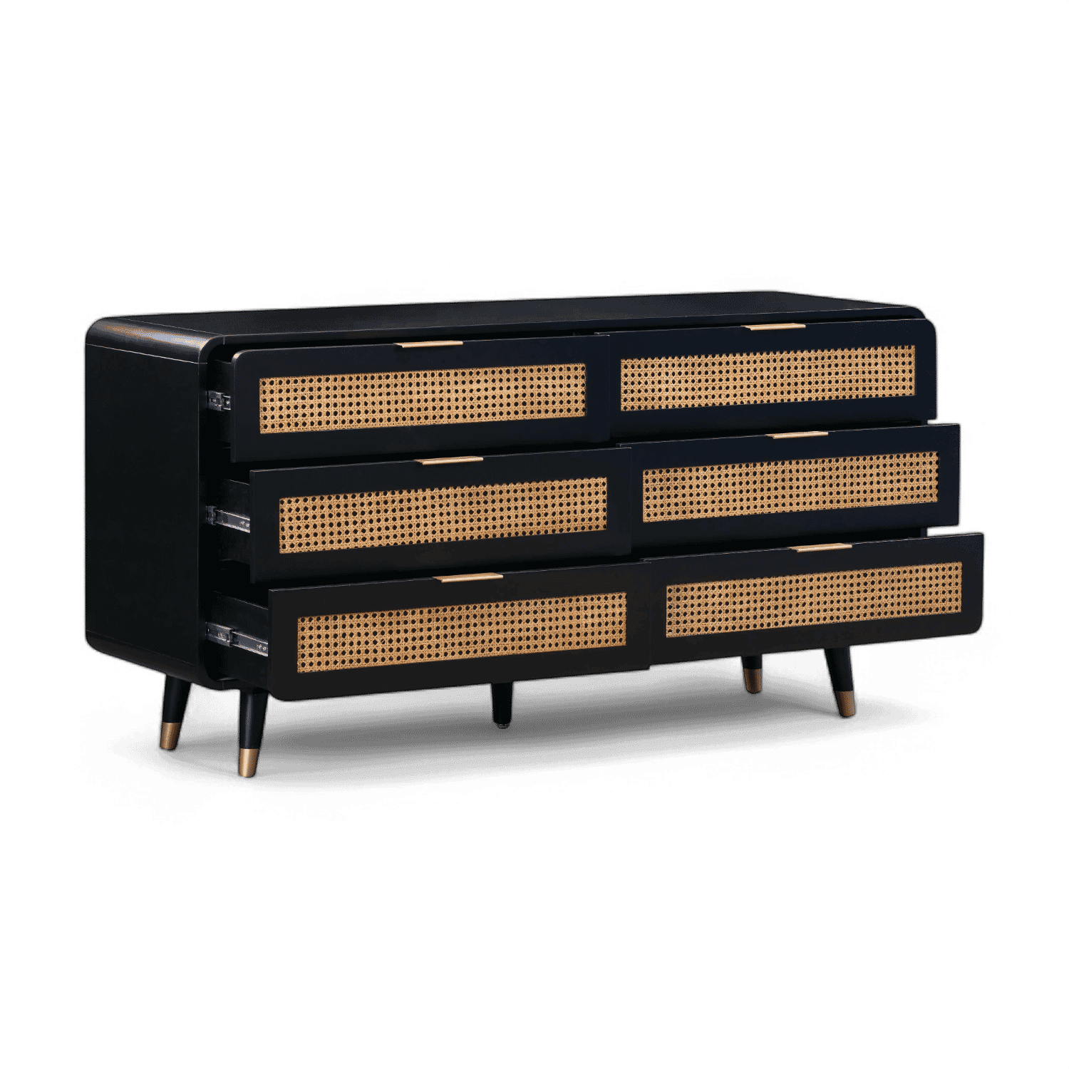 Acacia,MDF,Metal,Natural Cane | Six spacious drawers | Drawer dimensions: 28.9'W x 15'D x 5.1'H | Mid-Century Design