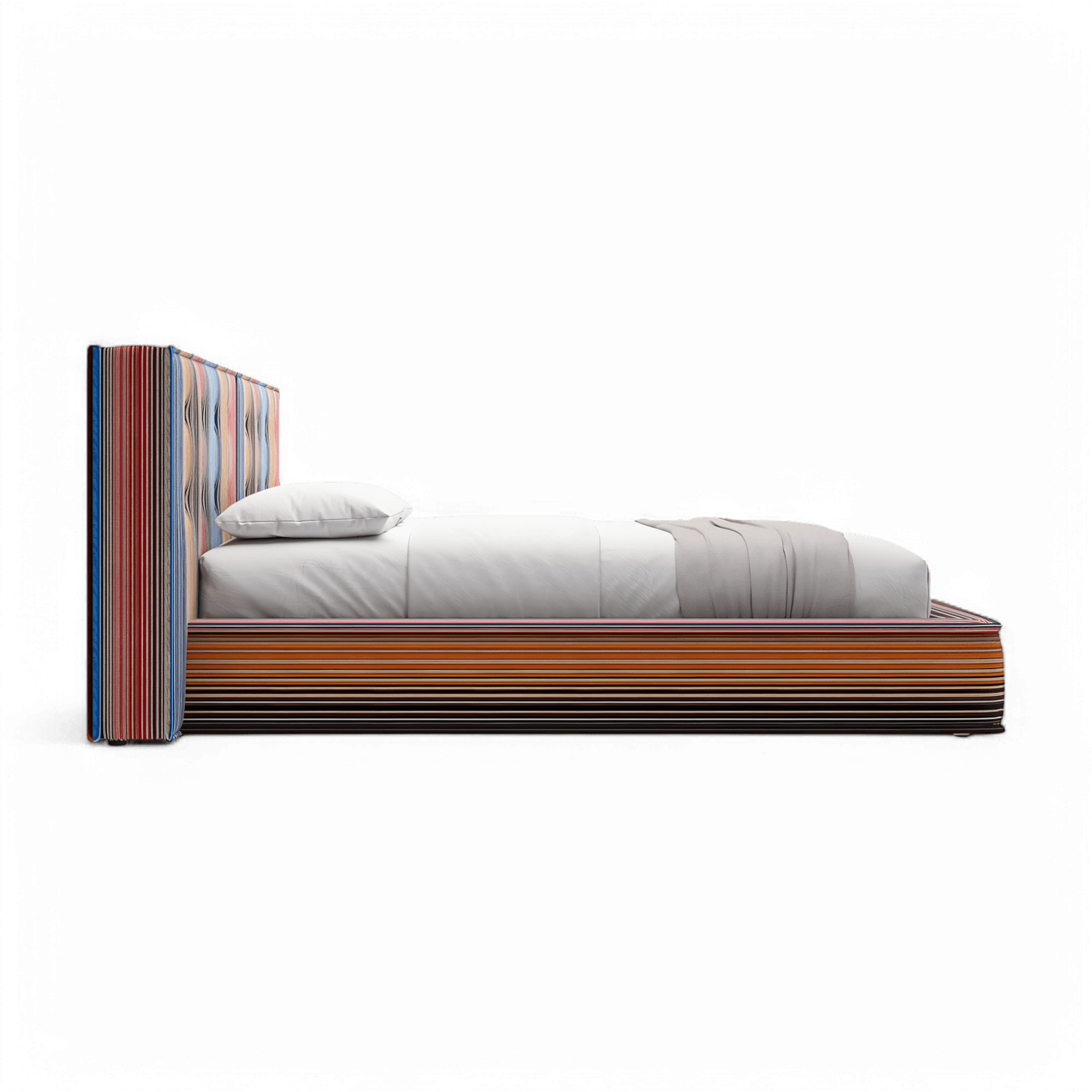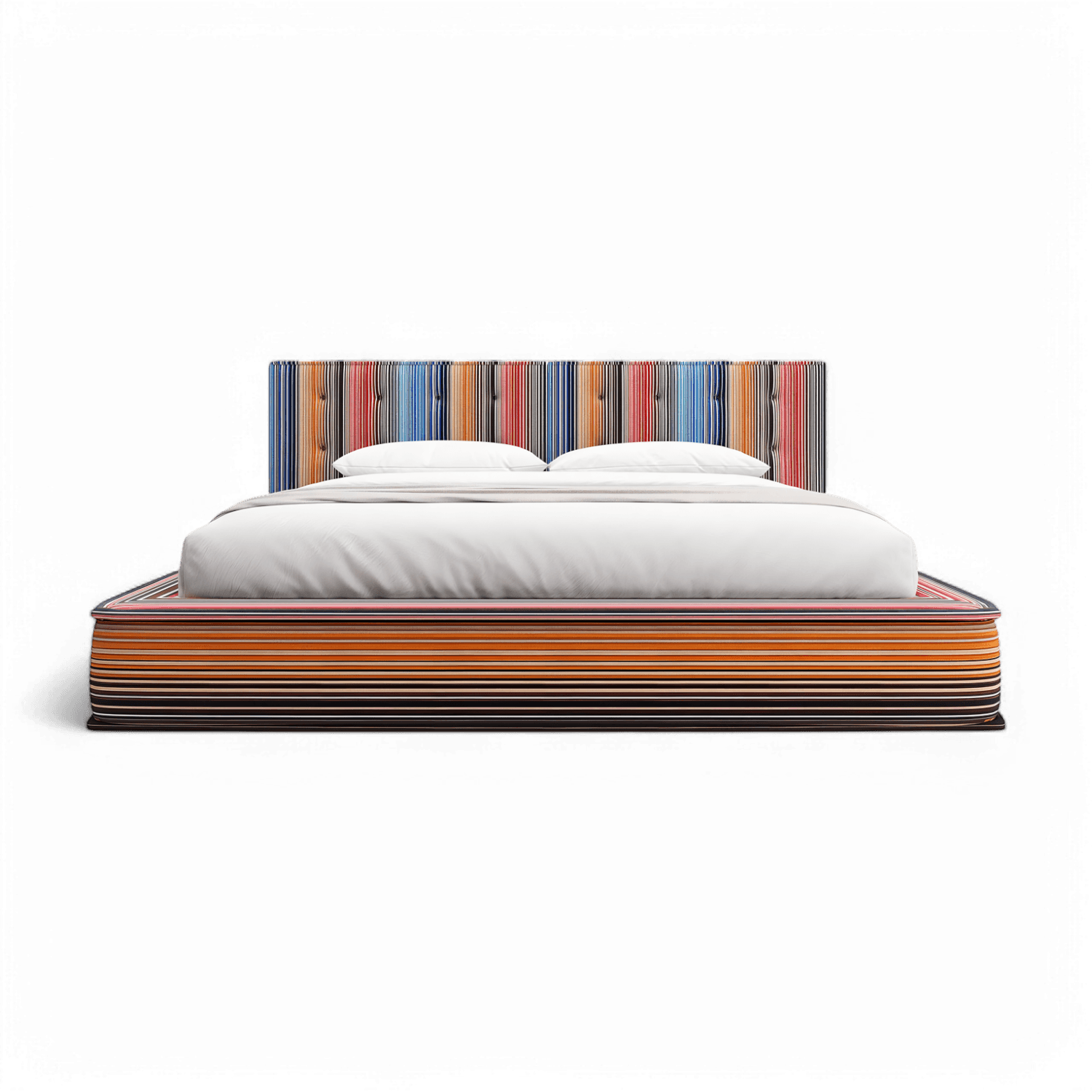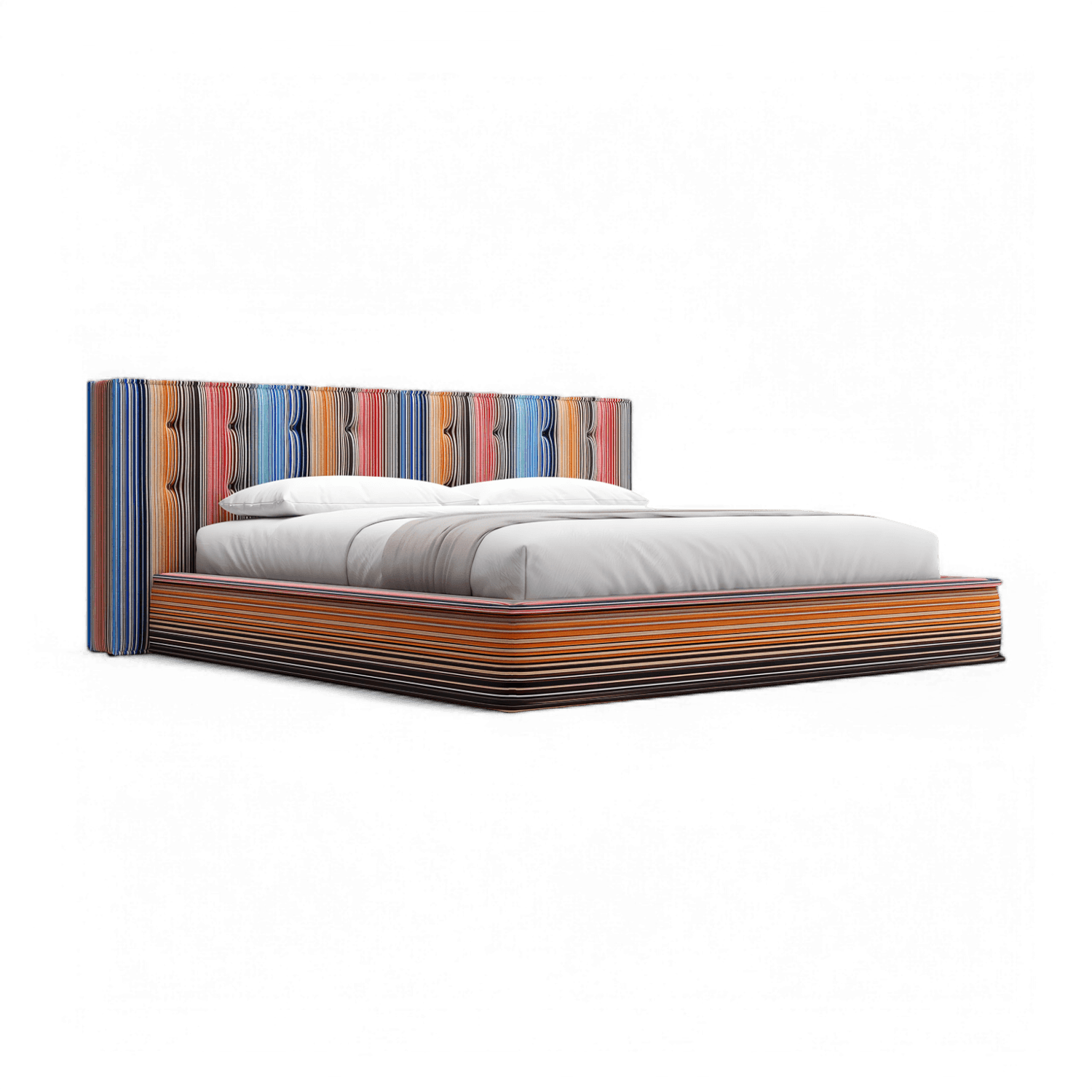 The Maili Bed is a statement piece that brings vibrant, bohemian charm to your bedroom. Its padded headboard and side rails are upholstered in a richly textured, striped fabric featuring a harmonious blend of blues, oranges, reds, and earthy tones. The bold yet balanced color palette evokes a sense of warmth and adventure, perfect for creating a cozy and eclectic space. Designed for both style and comfort, the Maili Bed is as inviting as it is eye-catching, making it the centerpiece of any bedroom.