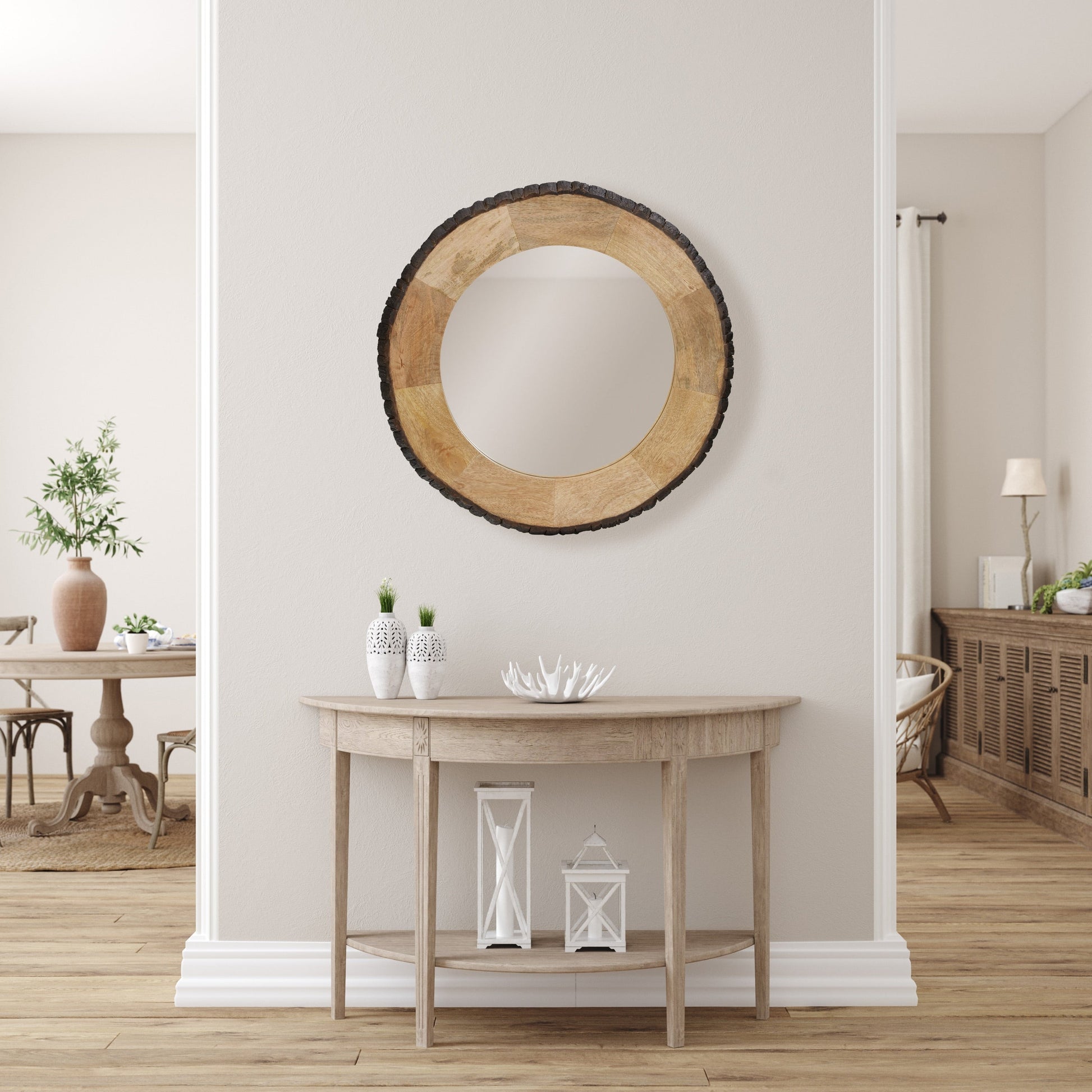 This round wall mirror makes a gorgeous, practical addition to your interior decor. Made from reflective glass and two-tone mango wood, it makes a great addition to bohemian or cottage-style decor. Perfect for placement in your bedroom or entryway, it's designed with a textured brown wood perimeter and smooth tan wood surrounding the glass for stylish contrast.