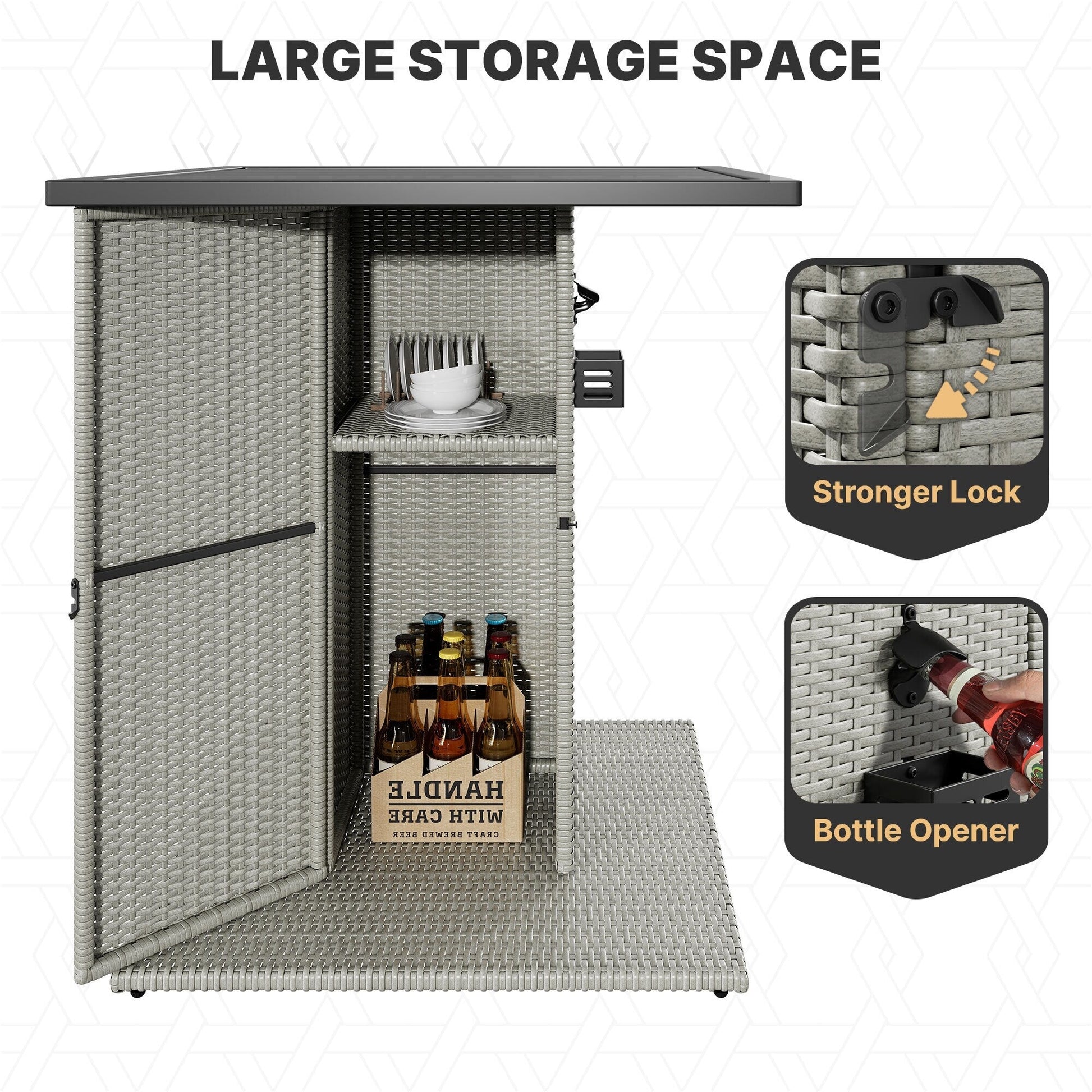 The bar table features a bottle opener and a storage compartment behind a magnetic door for added convenience. ???Great for entertaining your guests during informal gatherings, dining occasions, or poolside parties