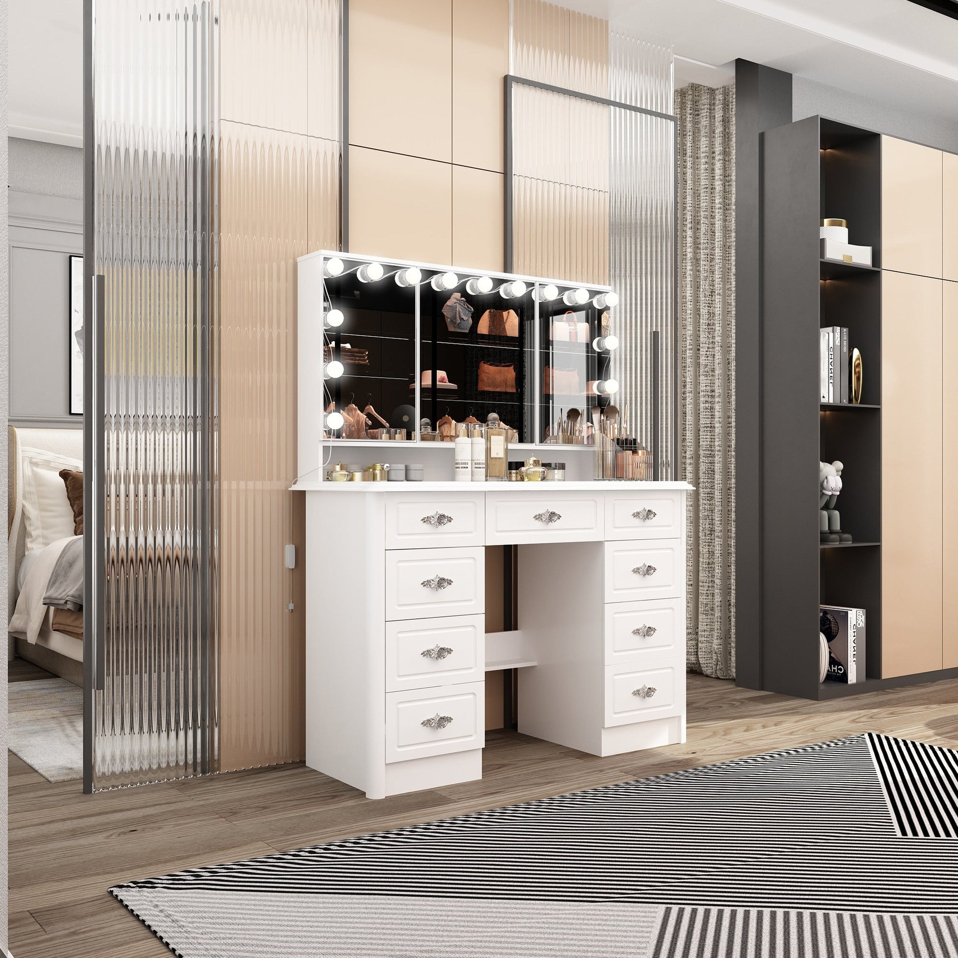 Elegant White Makeup Vanity with Tri-Fold Mirror and Adjustable Lighting