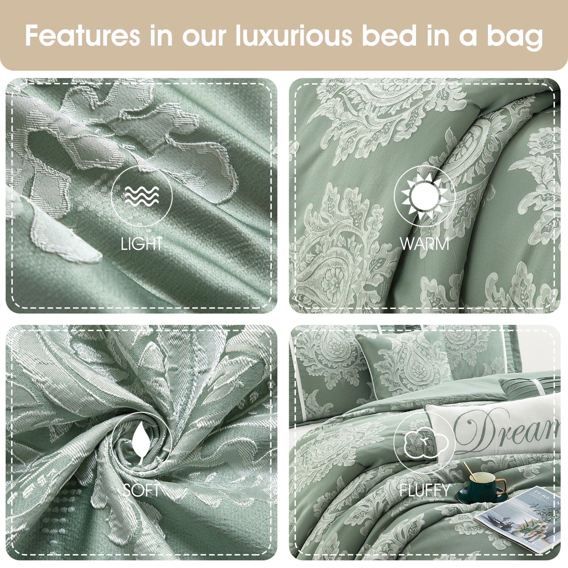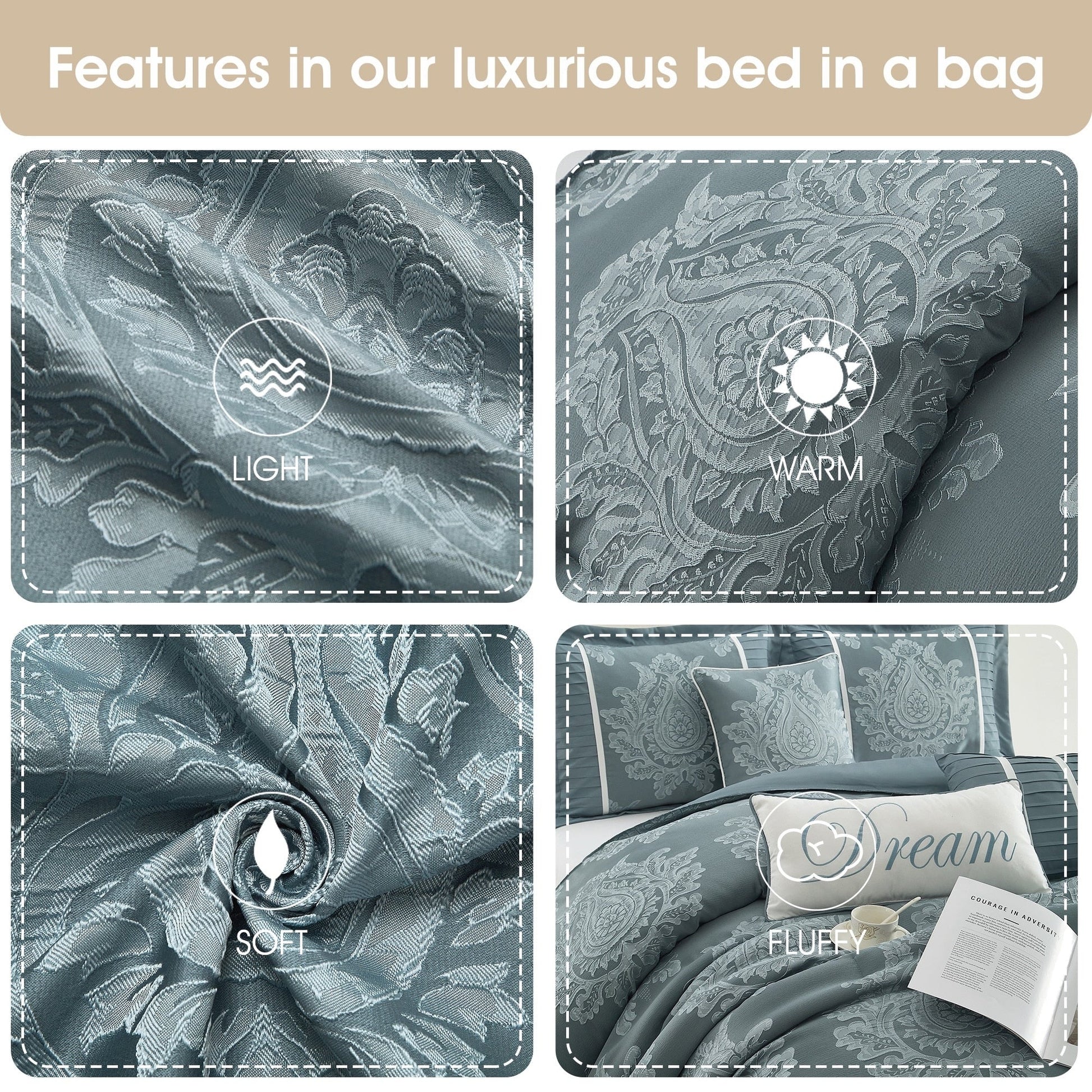 Introduce an air of timeless elegance to your bedroom with our luxurious 7-piece comforter set. The exquisite comforter and shams proudly exhibit a stunning jacquard medallion design with a pleated border, creating a visually striking and dimensional effect. Crafted from textured jacquard fabric, this set adds a touch of sophistication and charm to any decor style. Lightweight and perfect for all seasons, it elevates the overall ambiance of your space with its intricate details and classic design.
