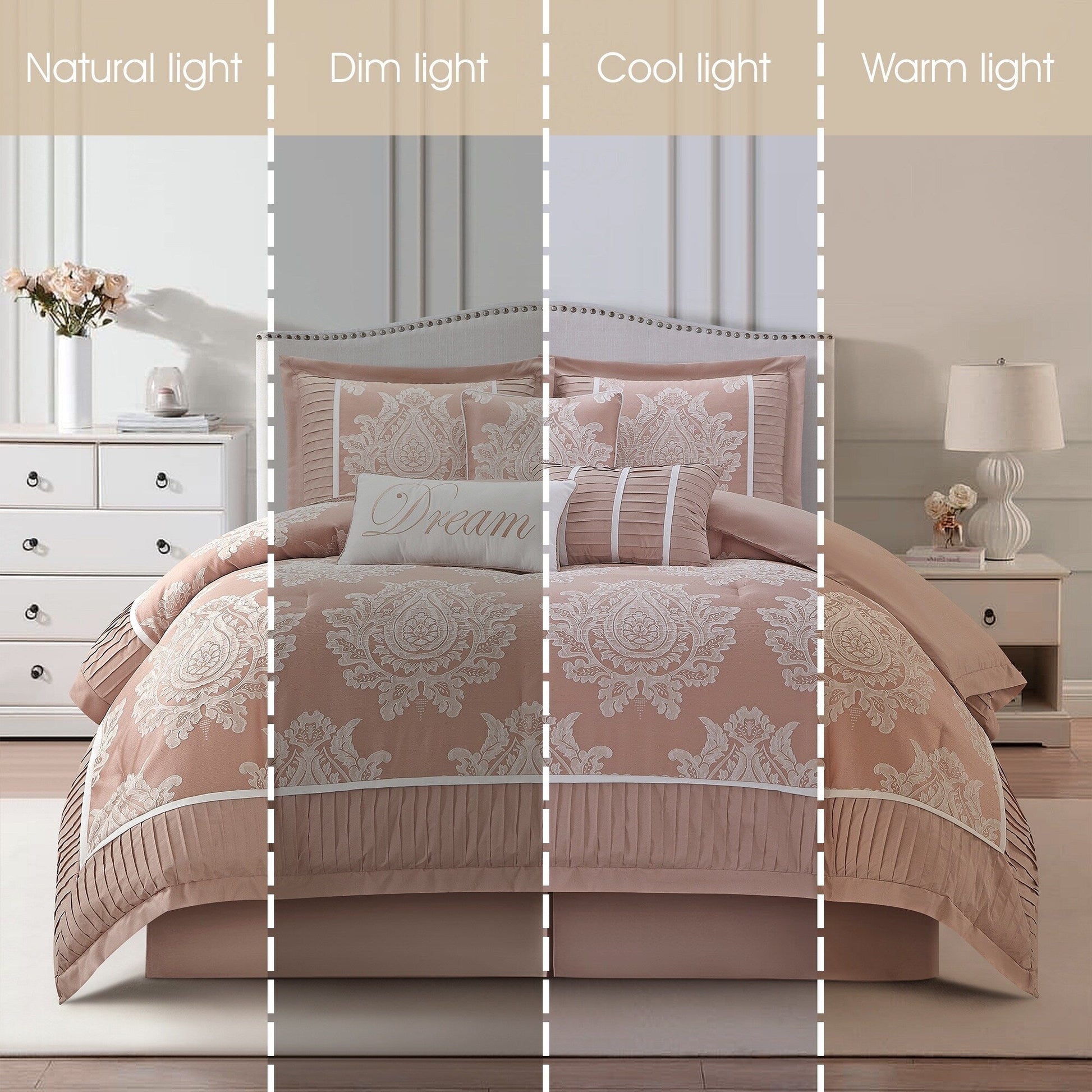 - Features: Elegant damask design and neutral color scheme to complement any traditional/glam bedroom décor