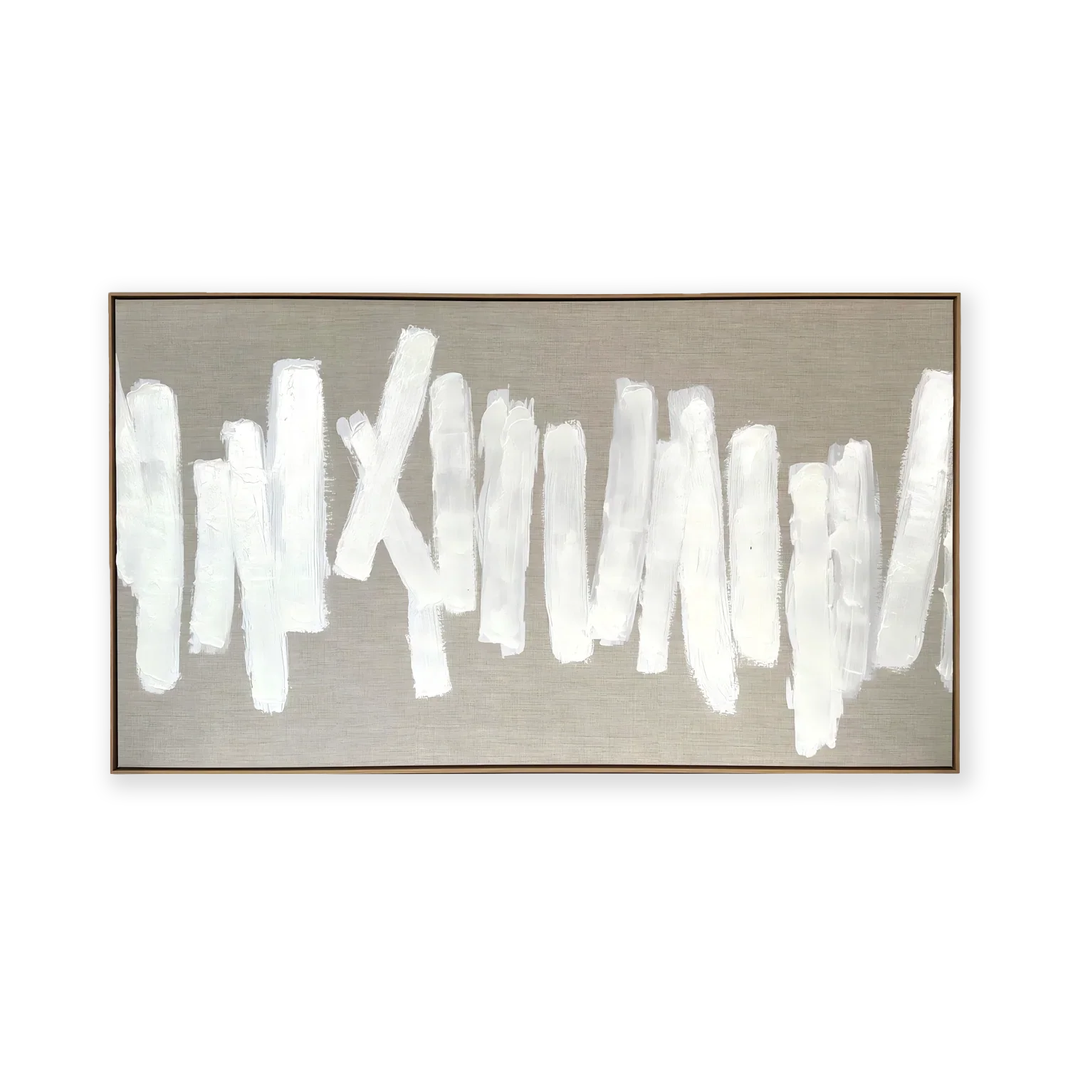 Neutral Cascade is a captivating horizontal canvas that combines elegance with dynamic texture. The interplay between the calm greige background and the lively white streaks creates a visually engaging piece that adds both texture and tranquility to any setting.