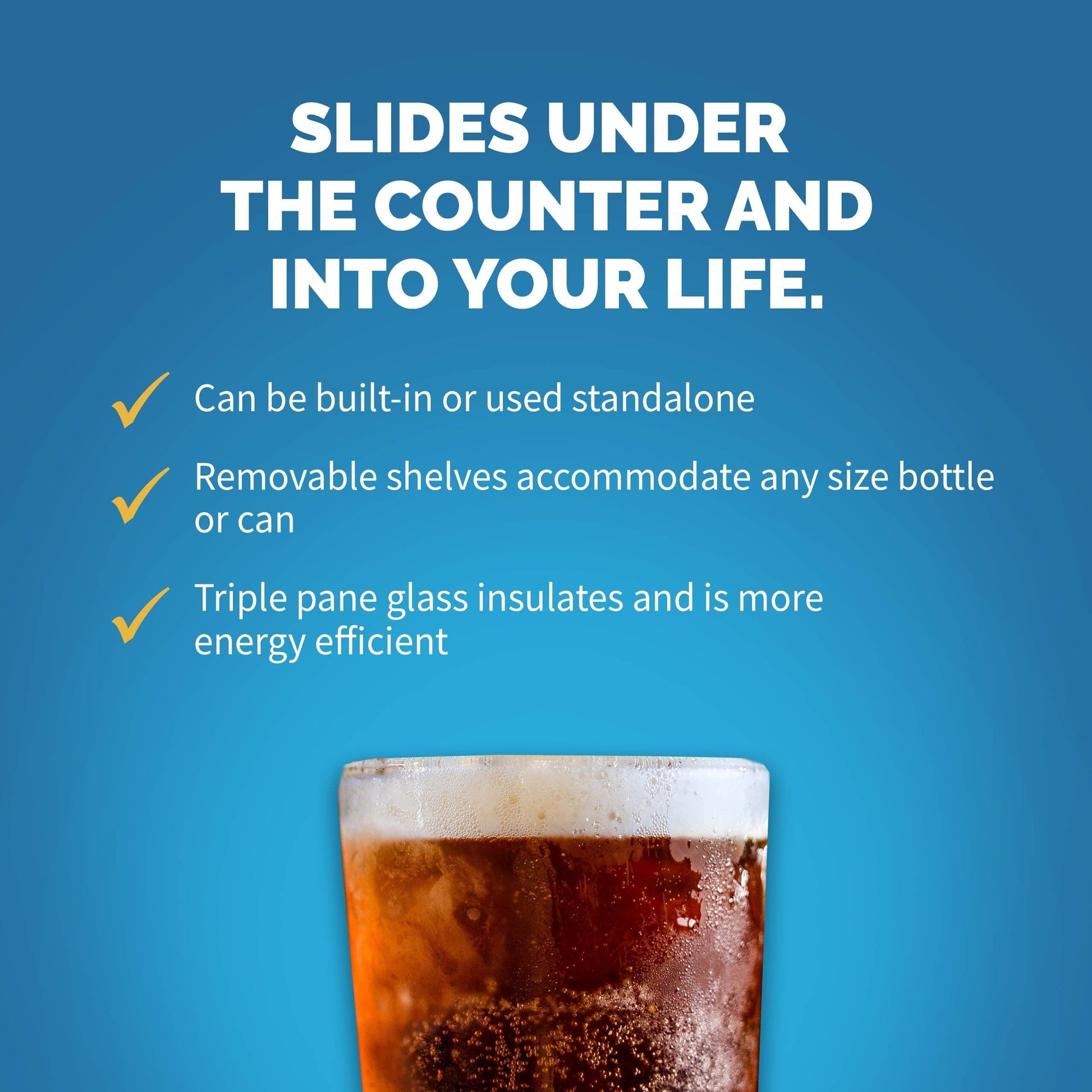 The quiet, front-venting compressor system allows this roomy beverage fridge to fit easily under standard kitchen counters. Just slide it into place for a sleek, integrated look that blends perfectly with your cabinetry — or let it stand alone. The choice is yours.