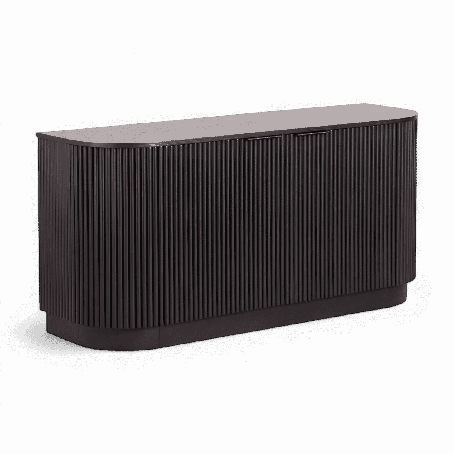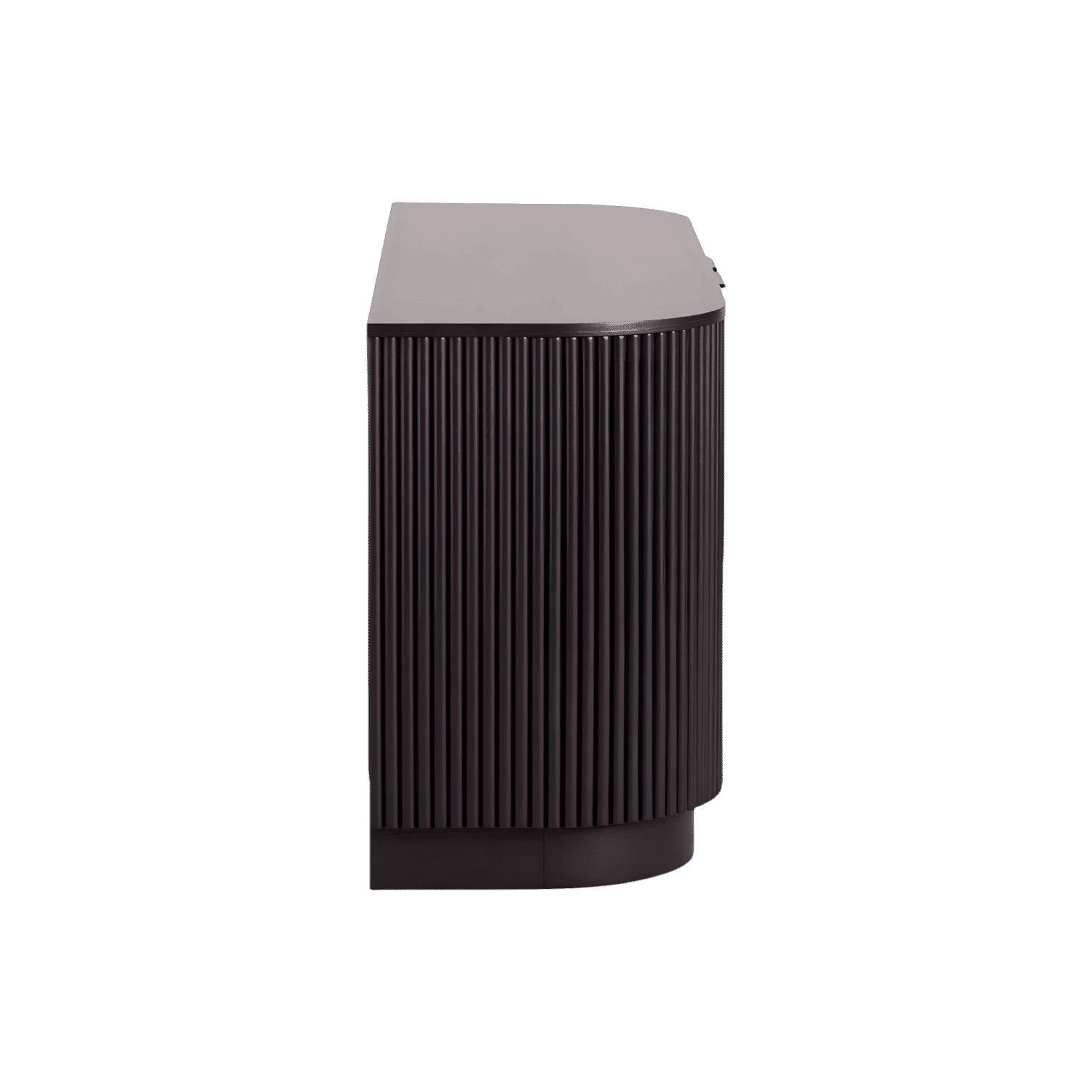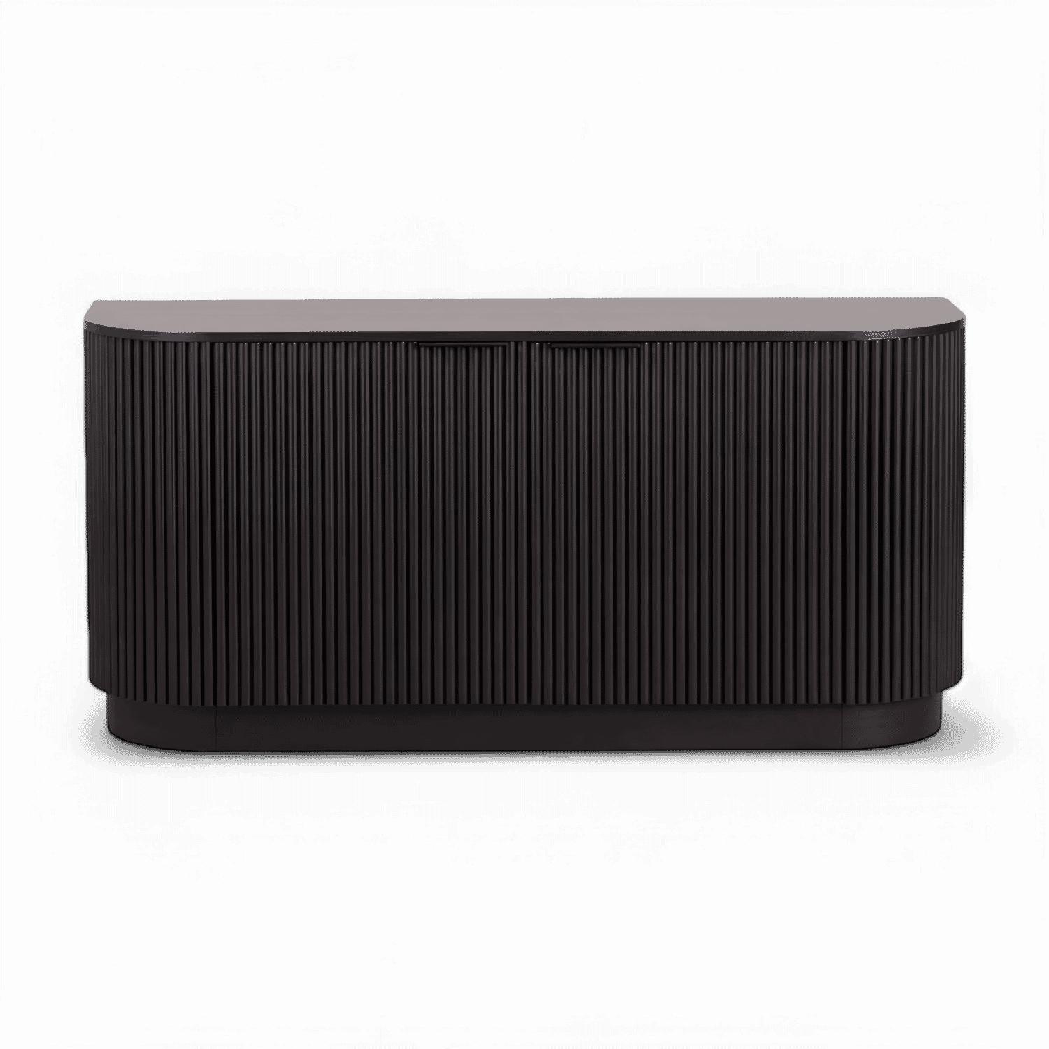 The buffet's softly rounded sides add a touch of refinement, creating a smooth silhouette that blends seamlessly into any space. The standout feature is the vertical slat wood detailing on the sides and doors, lending texture and visual interest to its clean, modern lines. With its thoughtful design and versatile aesthetic, the Oxford Buffet Black Wood is perfect for storing and displaying essentials in dining rooms, living spaces, or entryways.