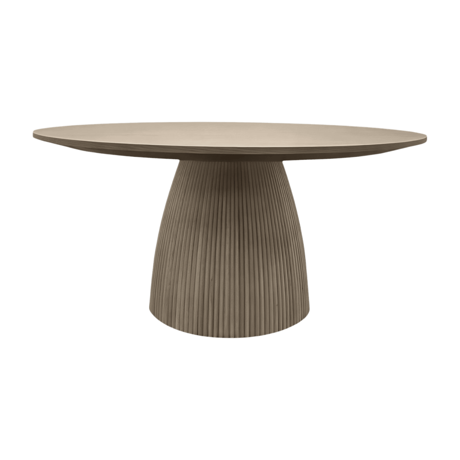 The standout feature of this table is its base design, showcasing an eye-catching arrangement of vertical wood slats that add depth and texture to the overall aesthetic. The combination of the clean, round tabletop and the artistic base creates a harmonious blend of modern and classic design elements, making the Oxford Dining Table Greige Oak a stylish and functional choice for your home.