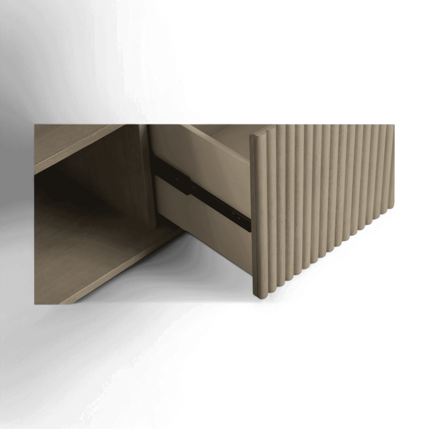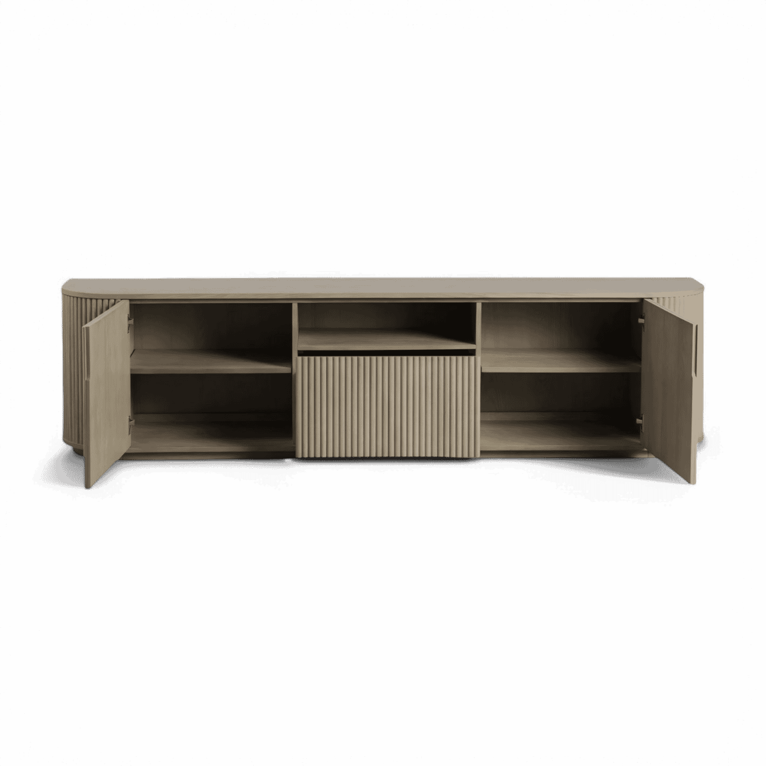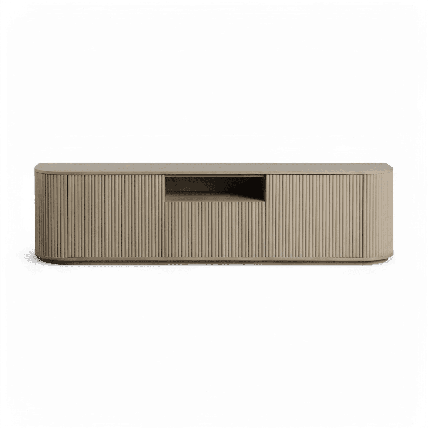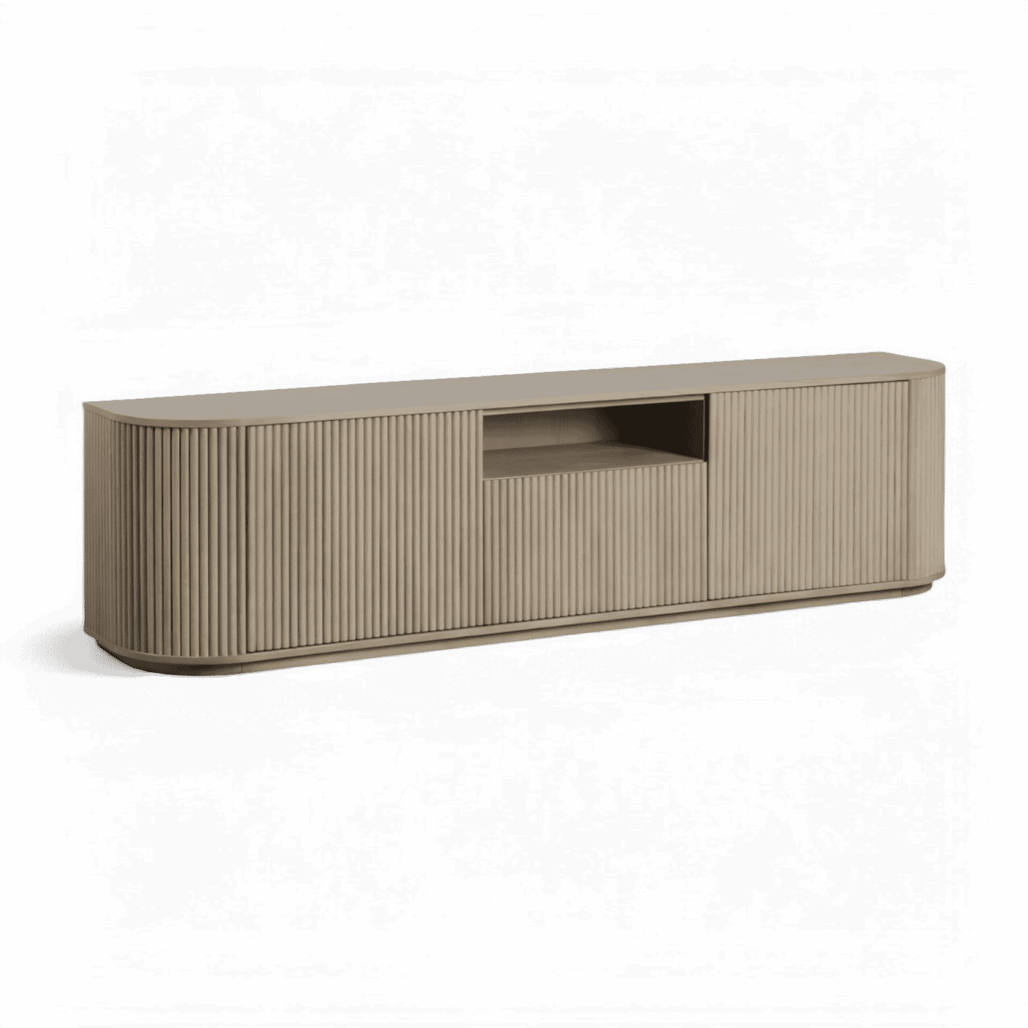 The Oxford TV Stand Greige Oak is a stylish and modern piece of furniture that beautifully combines functionality with contemporary design. Its rounded sides add a soft, inviting touch, while the front panels boast an eye-catching vertical wood slat design, making it a standout addition to any living space.
