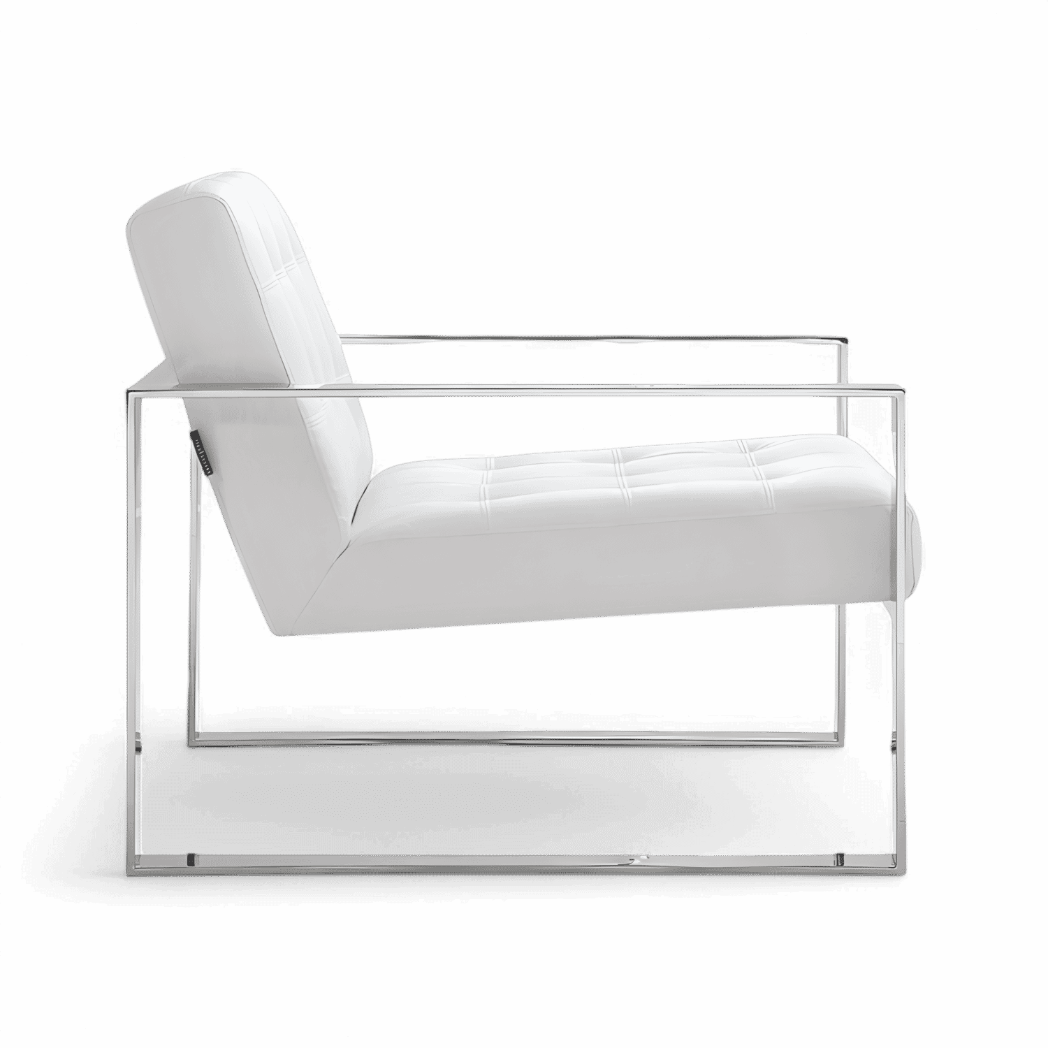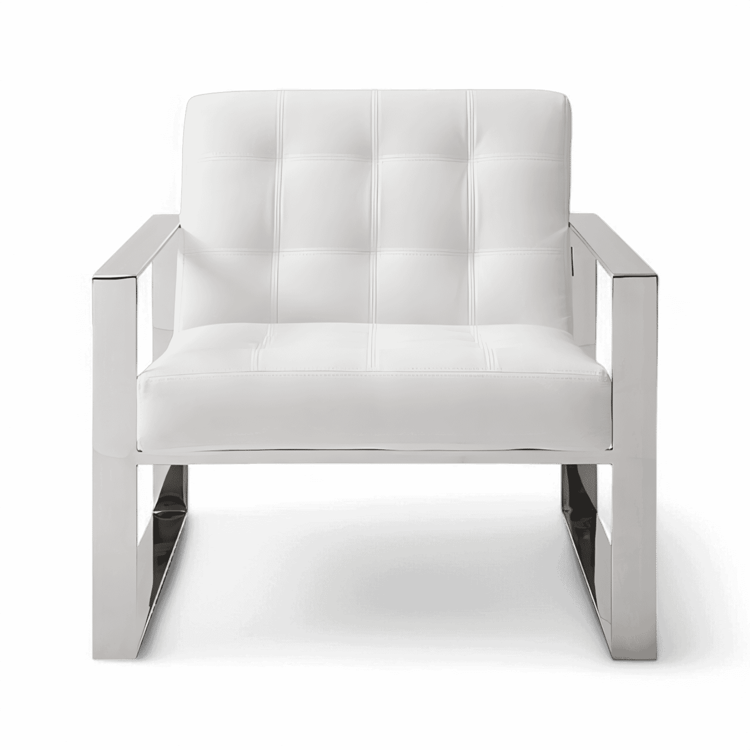 The ultra-modern Rivoli Armchair in White is an edgy, comfortable, and affordable addition to any home. Comprised of white eco leather and polished stainless-steel legs, this piece provides an alluring look. The tufted cushions have been overstuffed with support to aide in unwavering comfort.