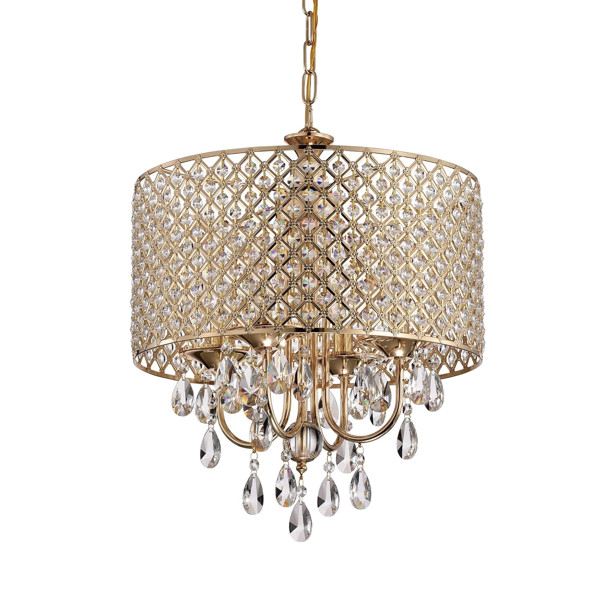 - 4-light chandelier: 17 in. Dia x 20 in. H with crystal hanging, Drum Dimensions: 17 in. Dia x 8.75 in. H