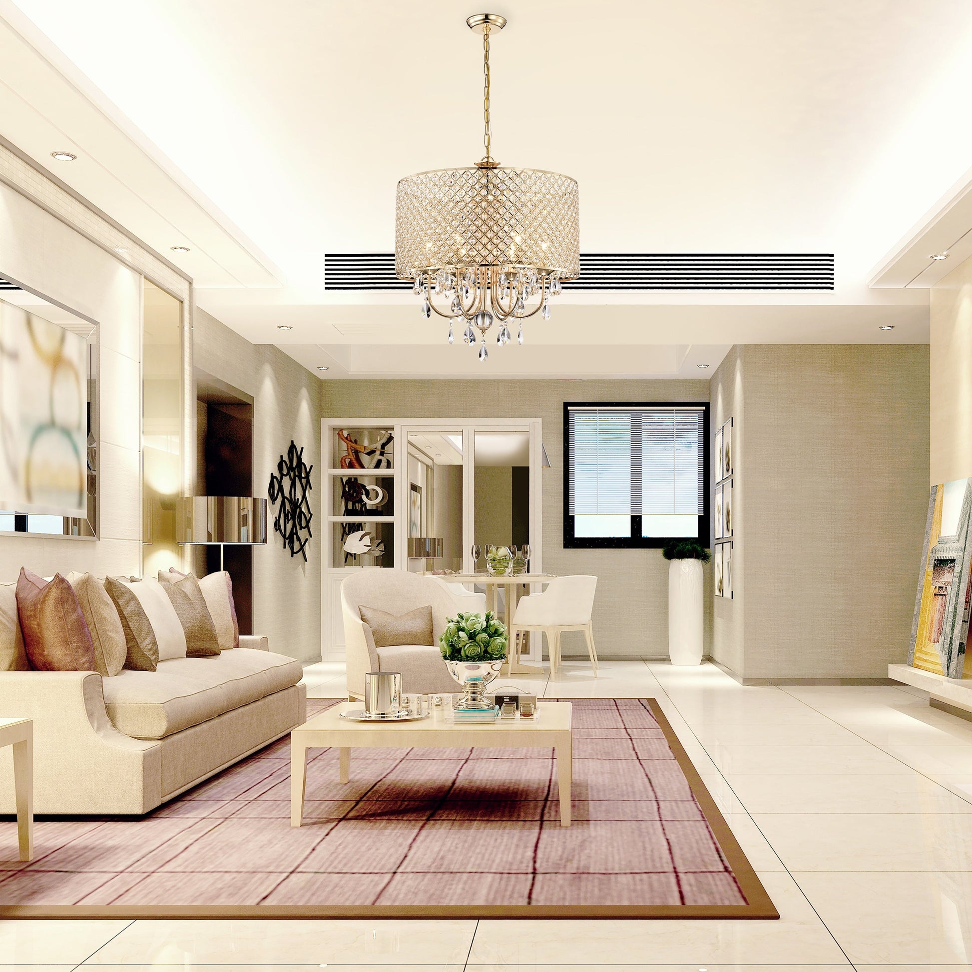 - 6-light chandelier: 22 in. Dia x 24 in. H with crystal hanging, Drum Dimensions: 22 in. Dia x 11 in. H