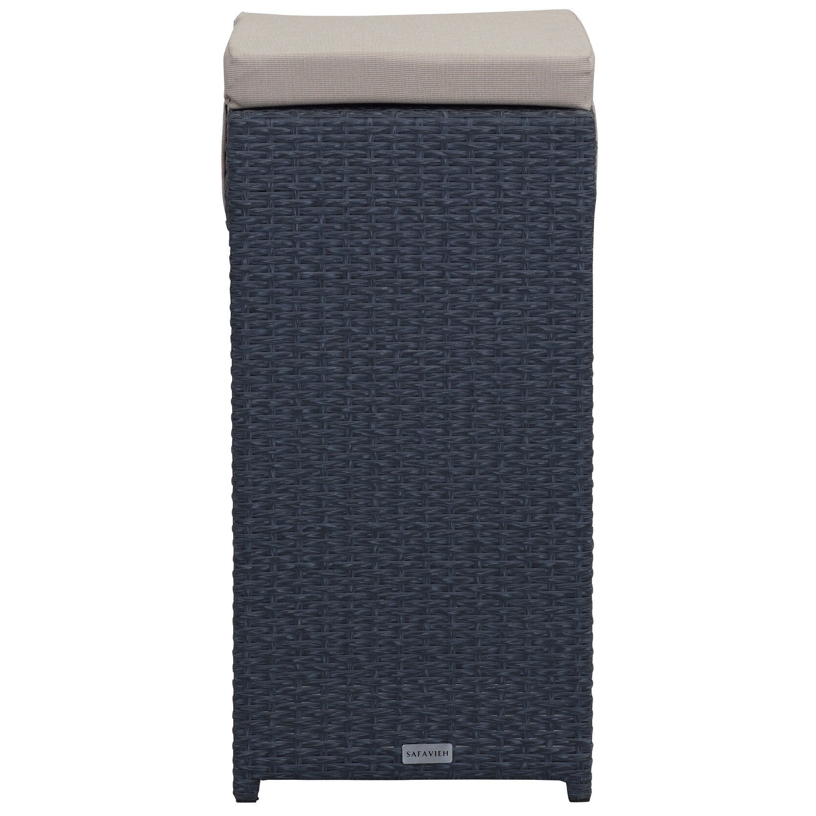Architectural lines create a beautiful but hardworking outdoor bar set with six stools and a Parson's style table for happy hour or meals. Crafted of all weather PE woven rattan in grey with tie back cushions in sand, this set is truly easy care.