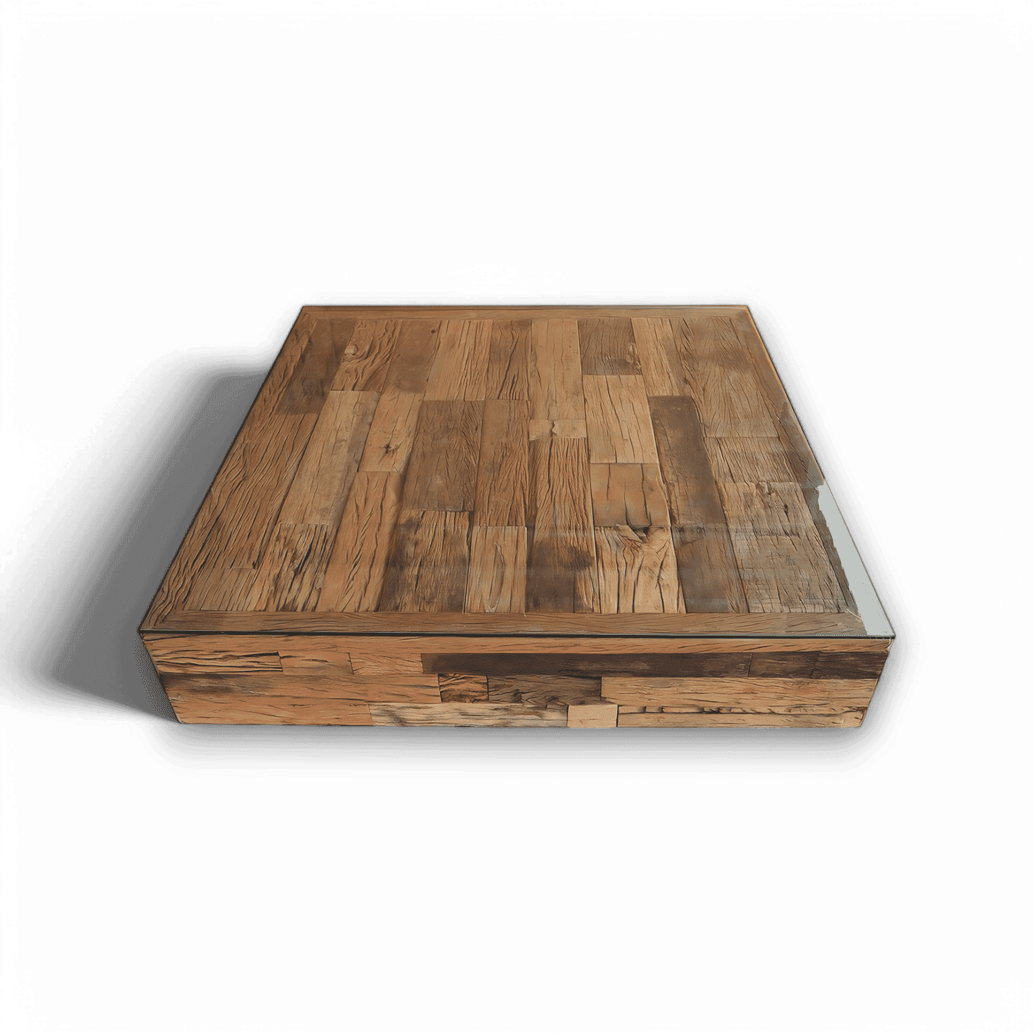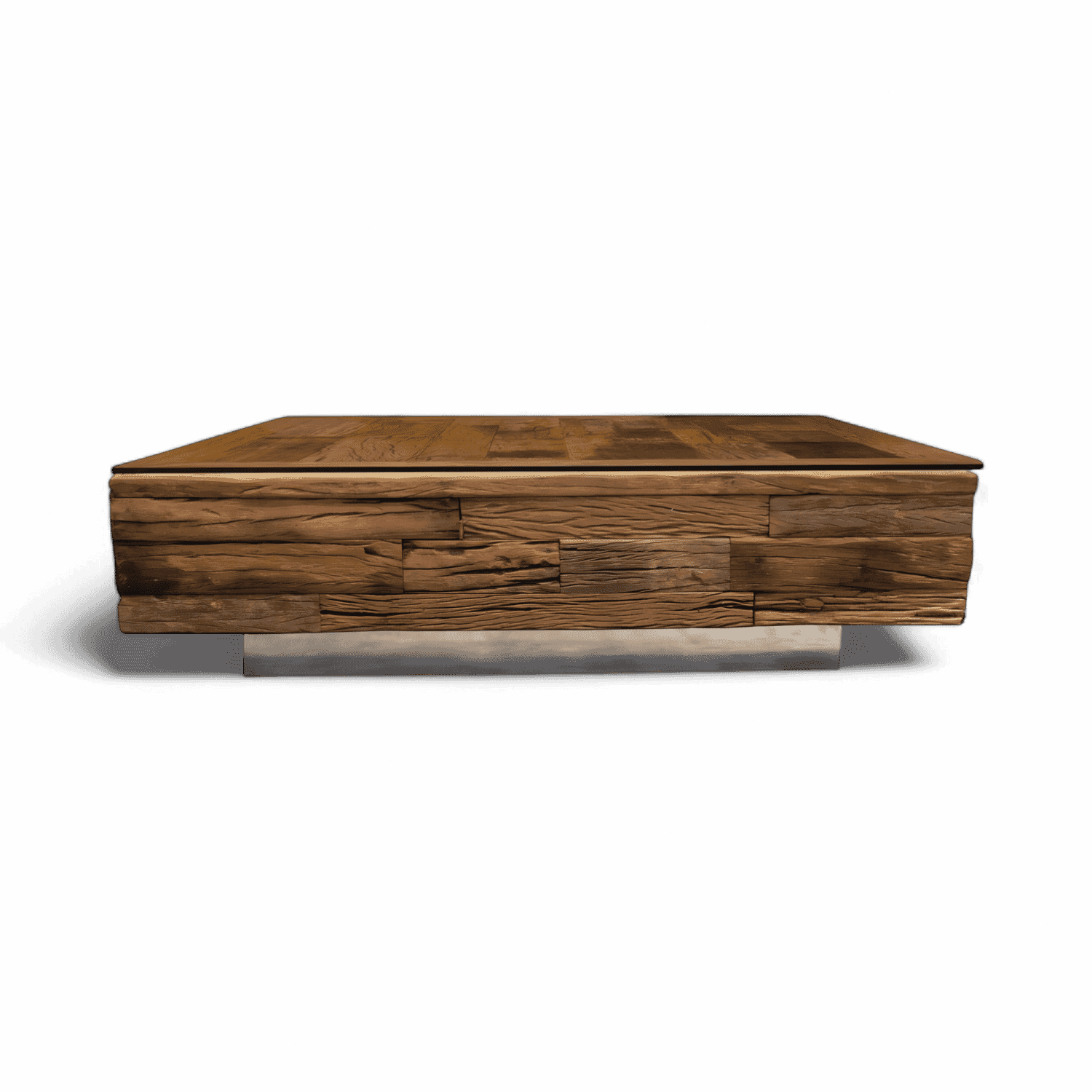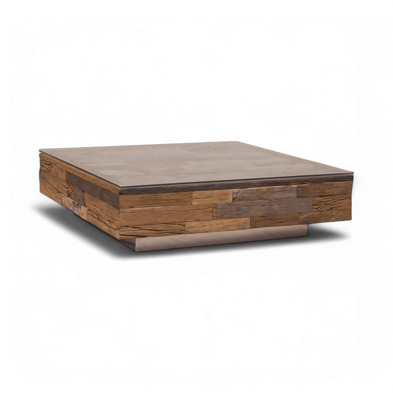 A vast mass, formed into a perfect square with immaculate 90-degree angles; created of Railway wood chunks all coalesced into a captivating form, the Samana coffee table bridges the gap between industrialism and natural creation. Tempered glass is arranged onto this stand as a peculiar window for one to peer into and see the individual crackling and grains that breathe life into each bar of lumber. The wooden planks are fastened to a steel base, polished to a high gloss, which makes it appear to levitate above the ground. Your guests will find themselves endlessly entertained by the stunning beauty of this piece.