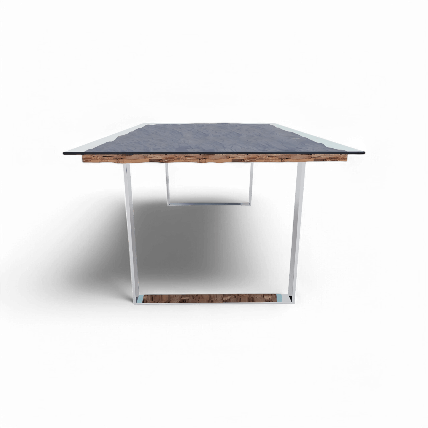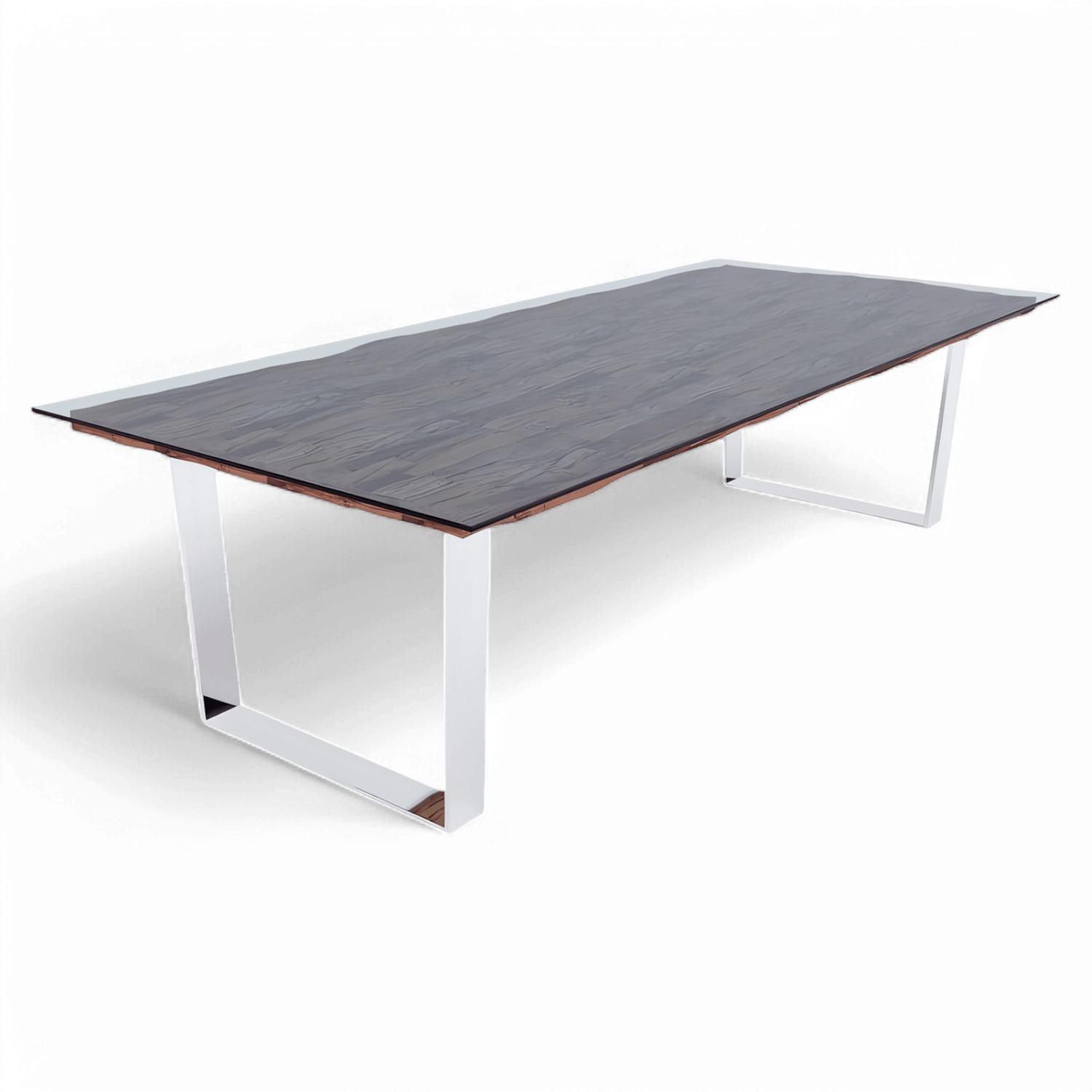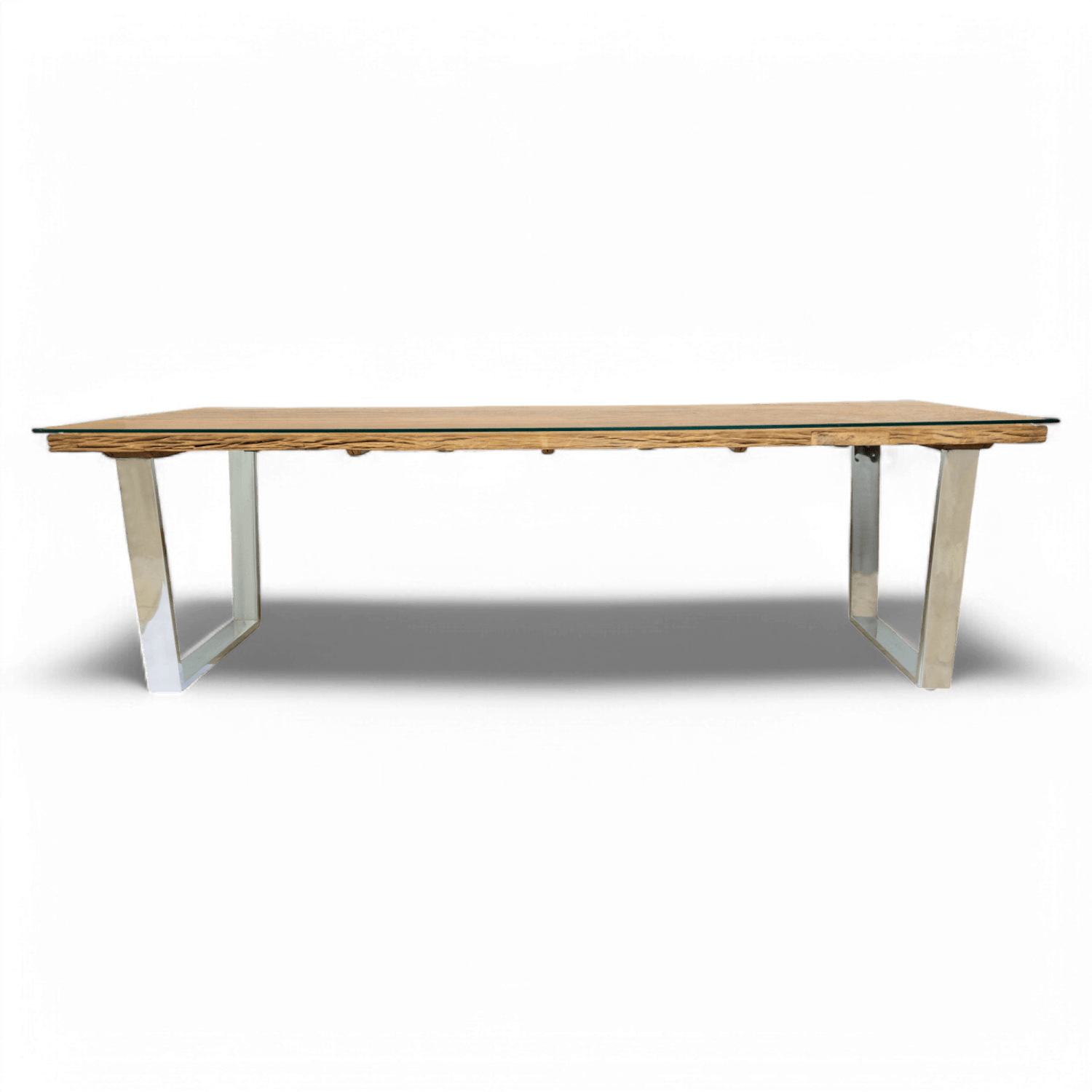 Top: Tempered Glass / Reclaimed Railway Wood Top | Legs: Polished Stainless Steel | Seating Capacity: 8-10