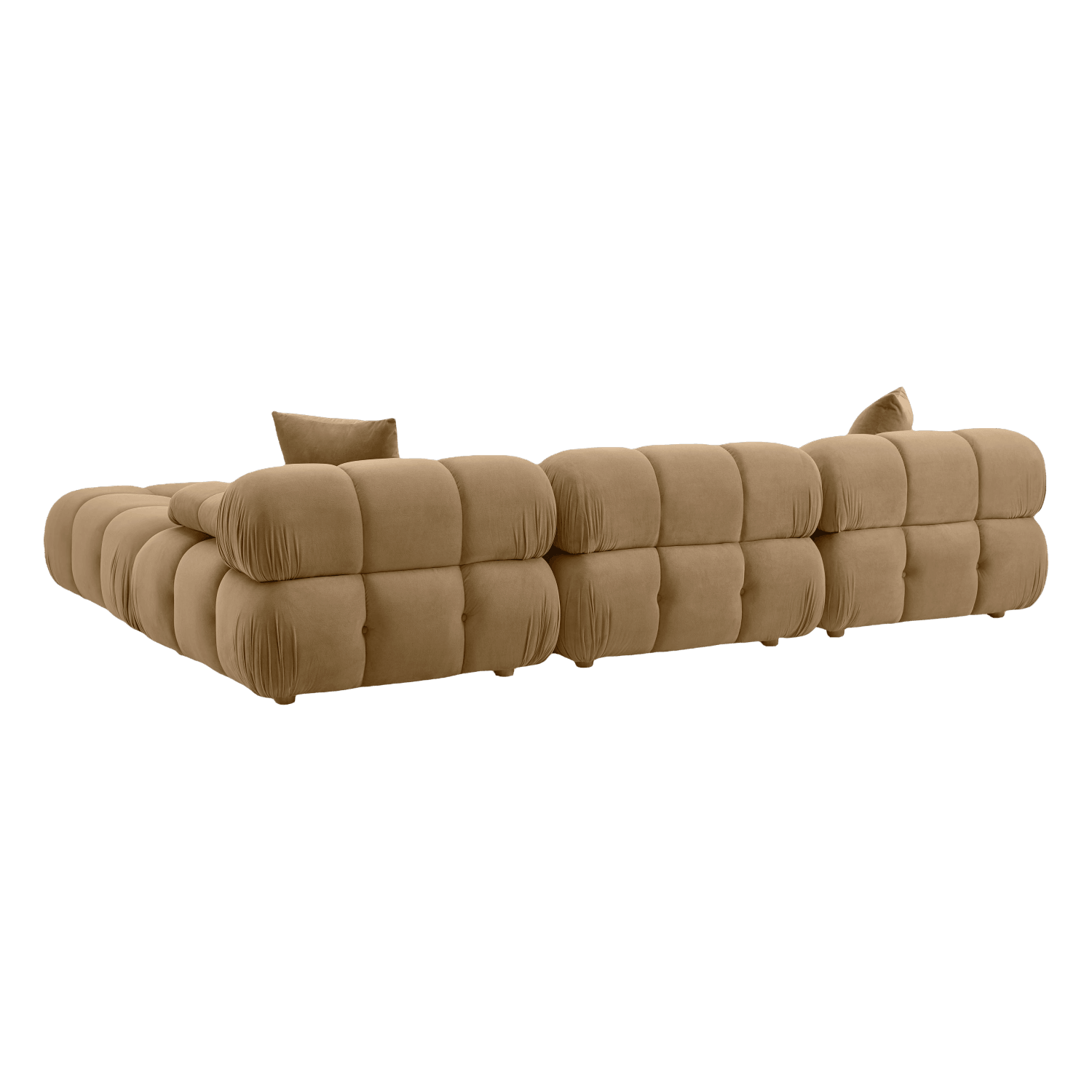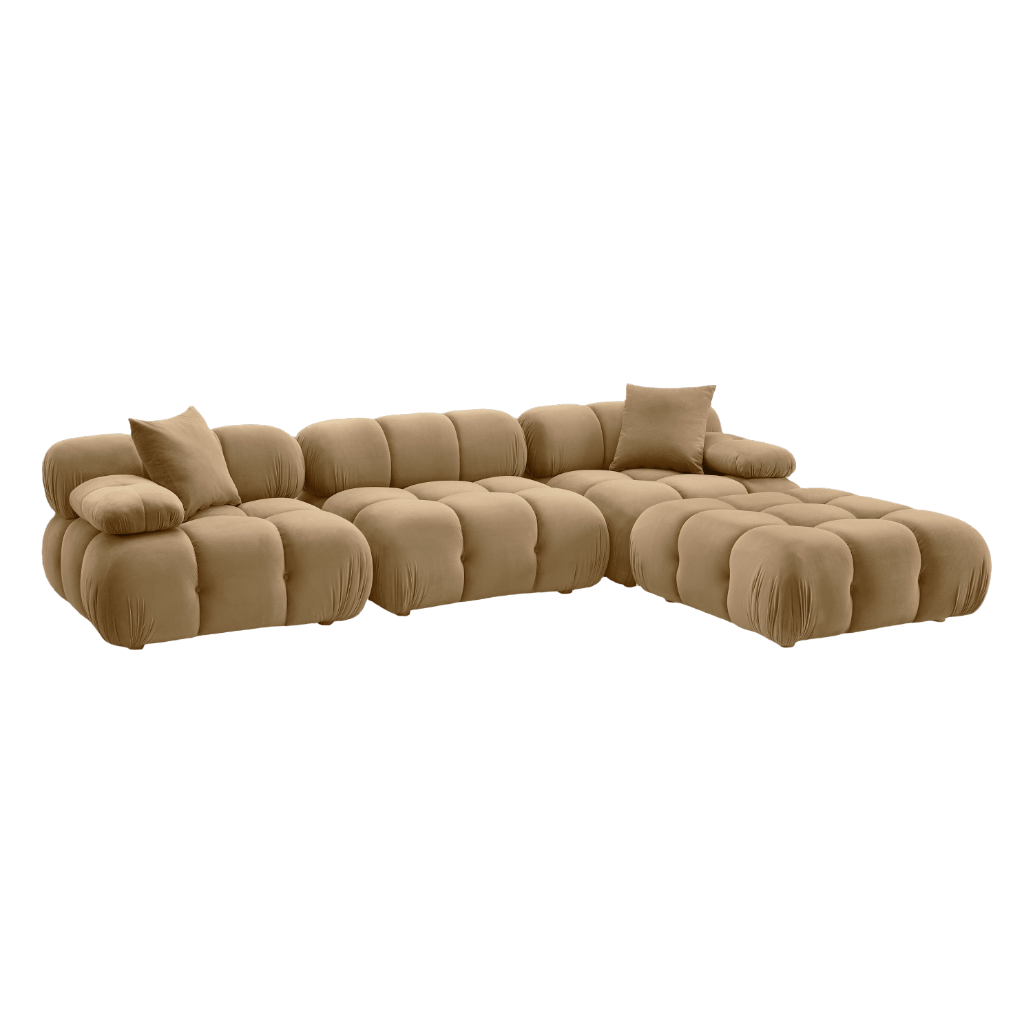 Experience luxury and flexibility with the Solace 4-piece Modular Sectional in Cafe Au Lait Velvet. This piece combines performance fabric with a customizable layout to create the perfect seating solution.