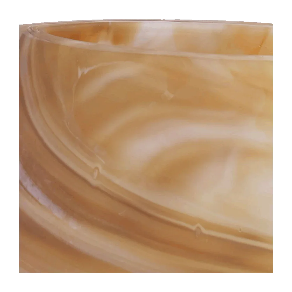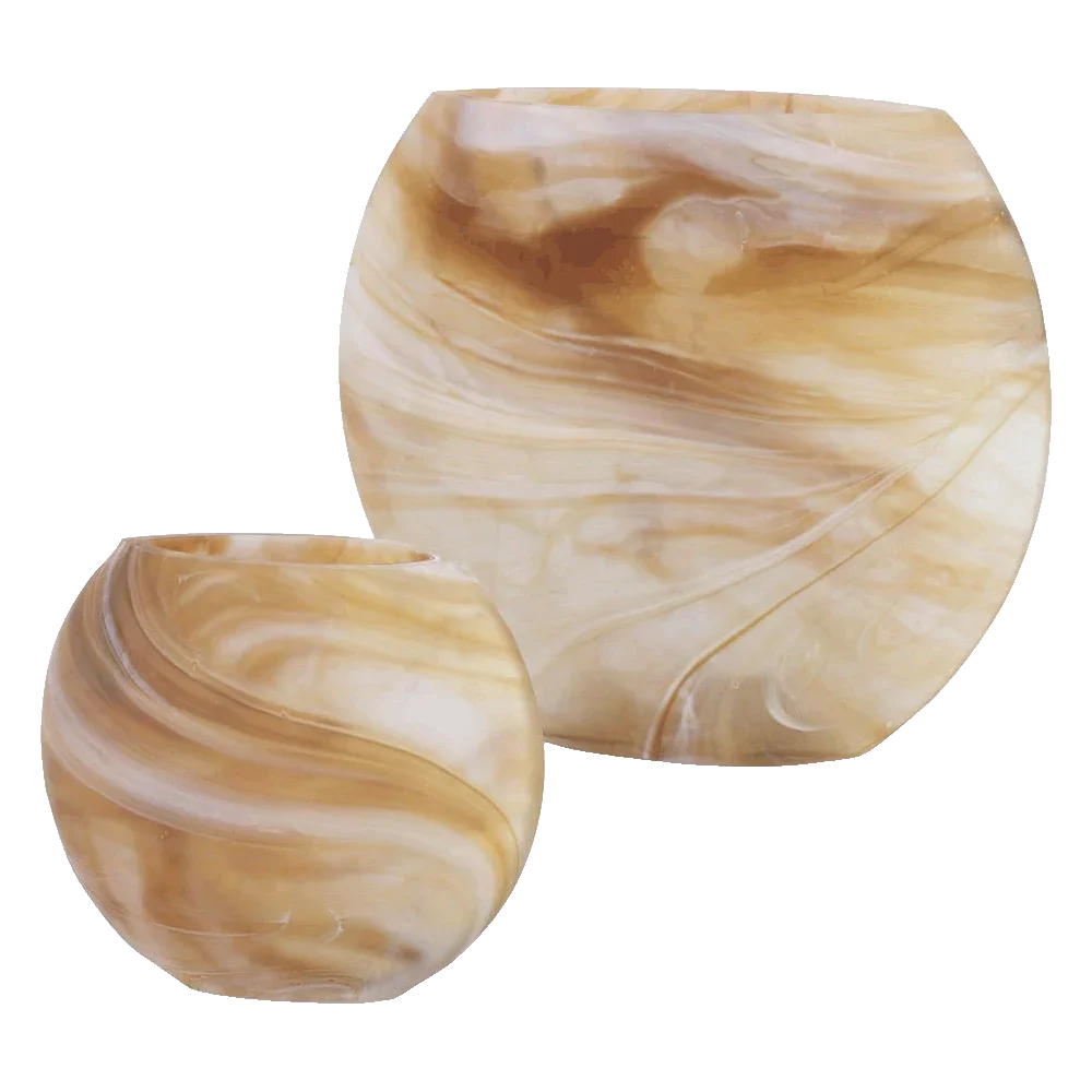 The Tula Vases are an elegant pair of decorative pieces, showcasing a mesmerizing marbled finish in warm, earthy tones of amber and cream. The set includes a small vase and large vase. The swirling patterns and glossy texture make these vases a sophisticated accent for any modern or minimalist interior.