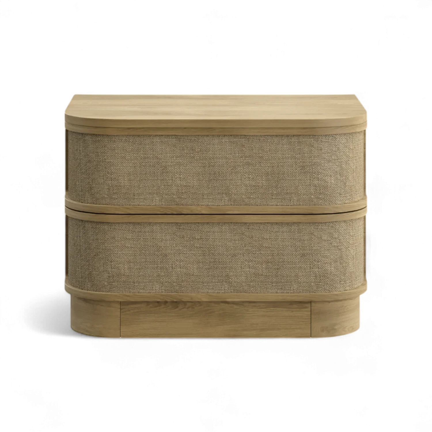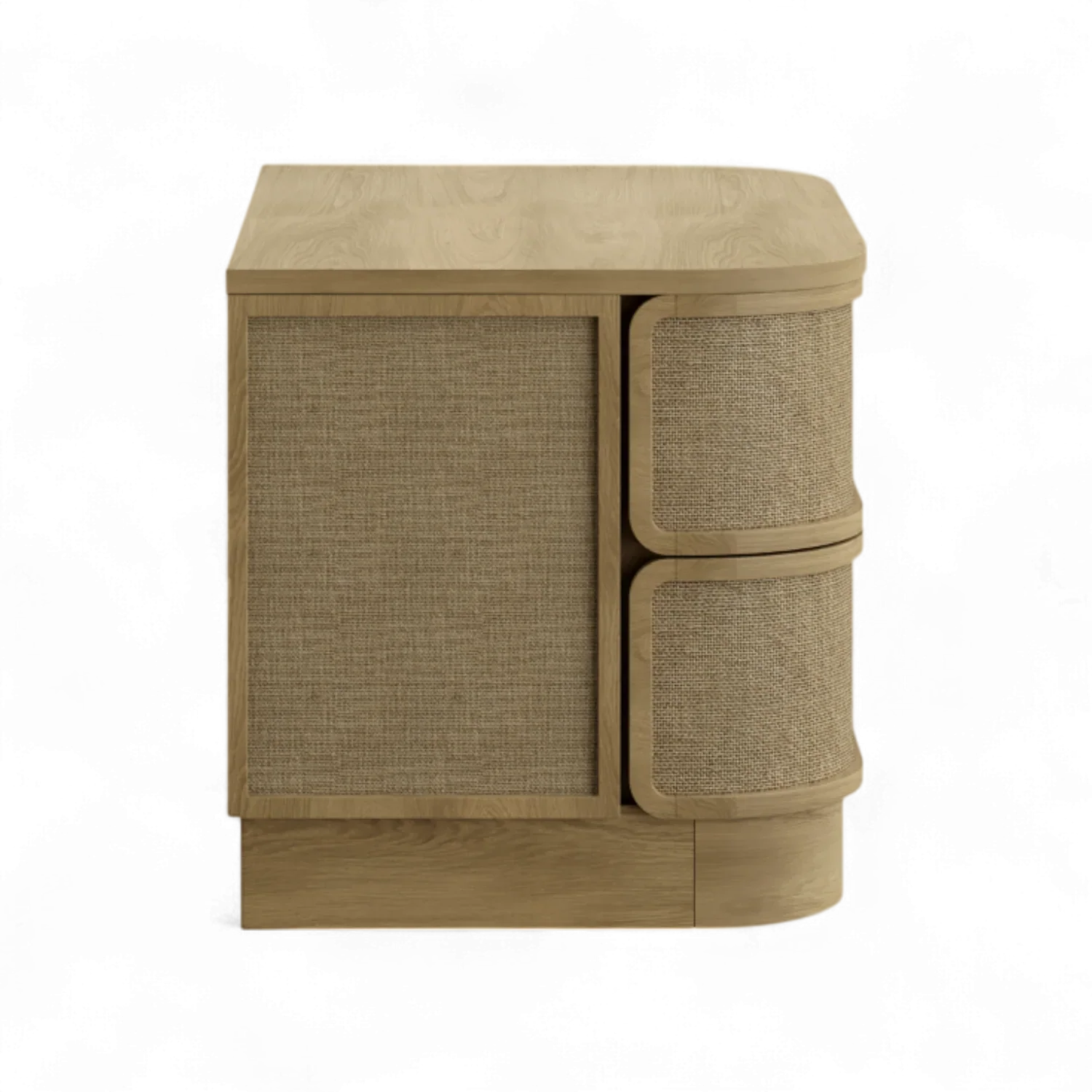 The Windsor Nightstand is a sophisticated blend of modern elegance and natural charm. Its top is finished with a stunning greige oak veneer, showcasing a soft, neutral tone that complements any bedroom décor. The sides and drawer fronts are accented with intricately woven cane, adding texture and a touch of organic warmth. Combining functionality with style, this nightstand offers ample storage space while making a statement with its unique design. Perfect for creating a serene and stylish retreat in your home.