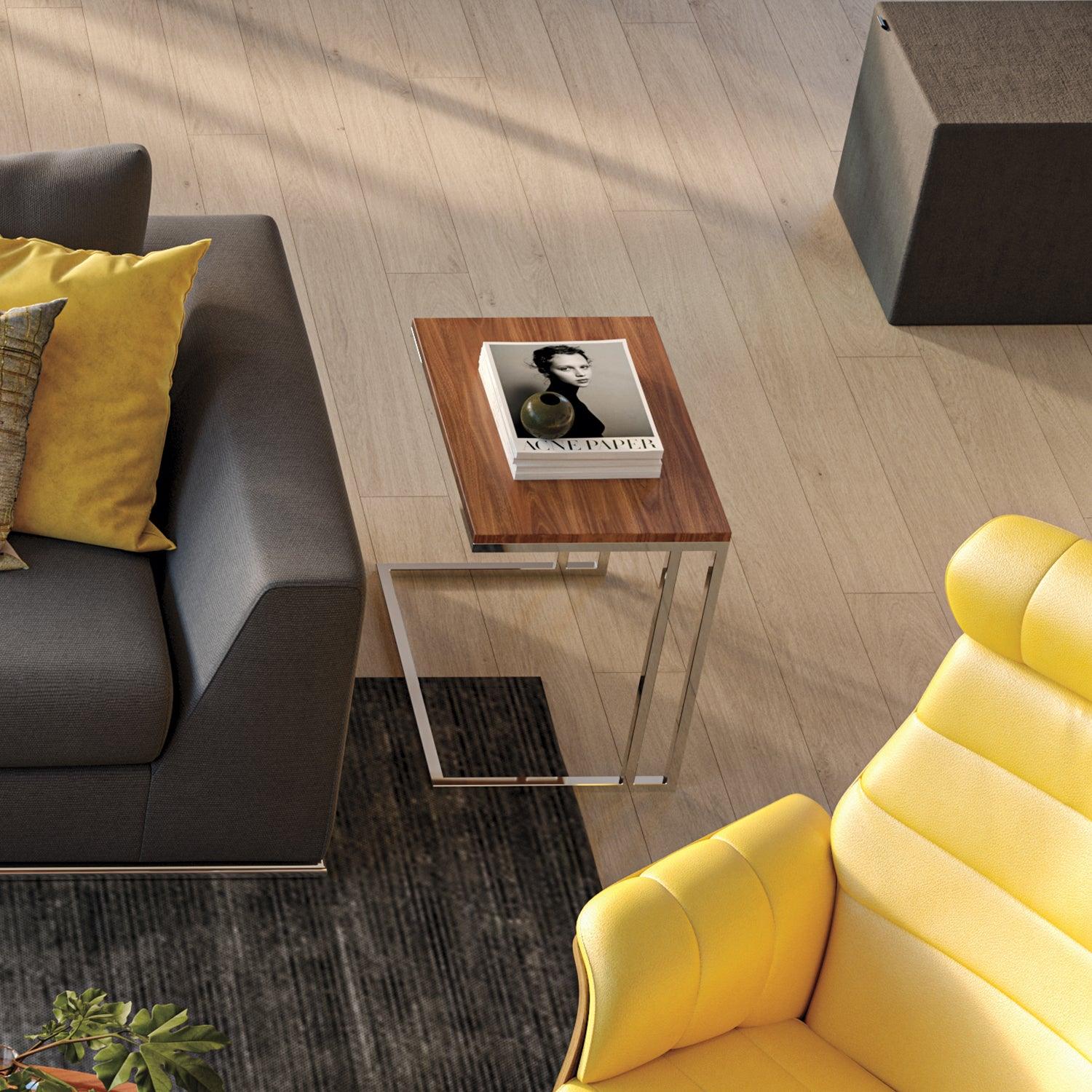 The Zary Mid Century Modern Side Table Walnut is designed to fit an array of specifically modern and contemporary homes. The walnut wood surface rests atop a silver finish frame, and works great as an end table or nested with a sofa. Its simple and clean design makes this table incredibly versatile, yet functional. The smooth architectural design of the Zary Table will provide any room with minimalist but modern detail.