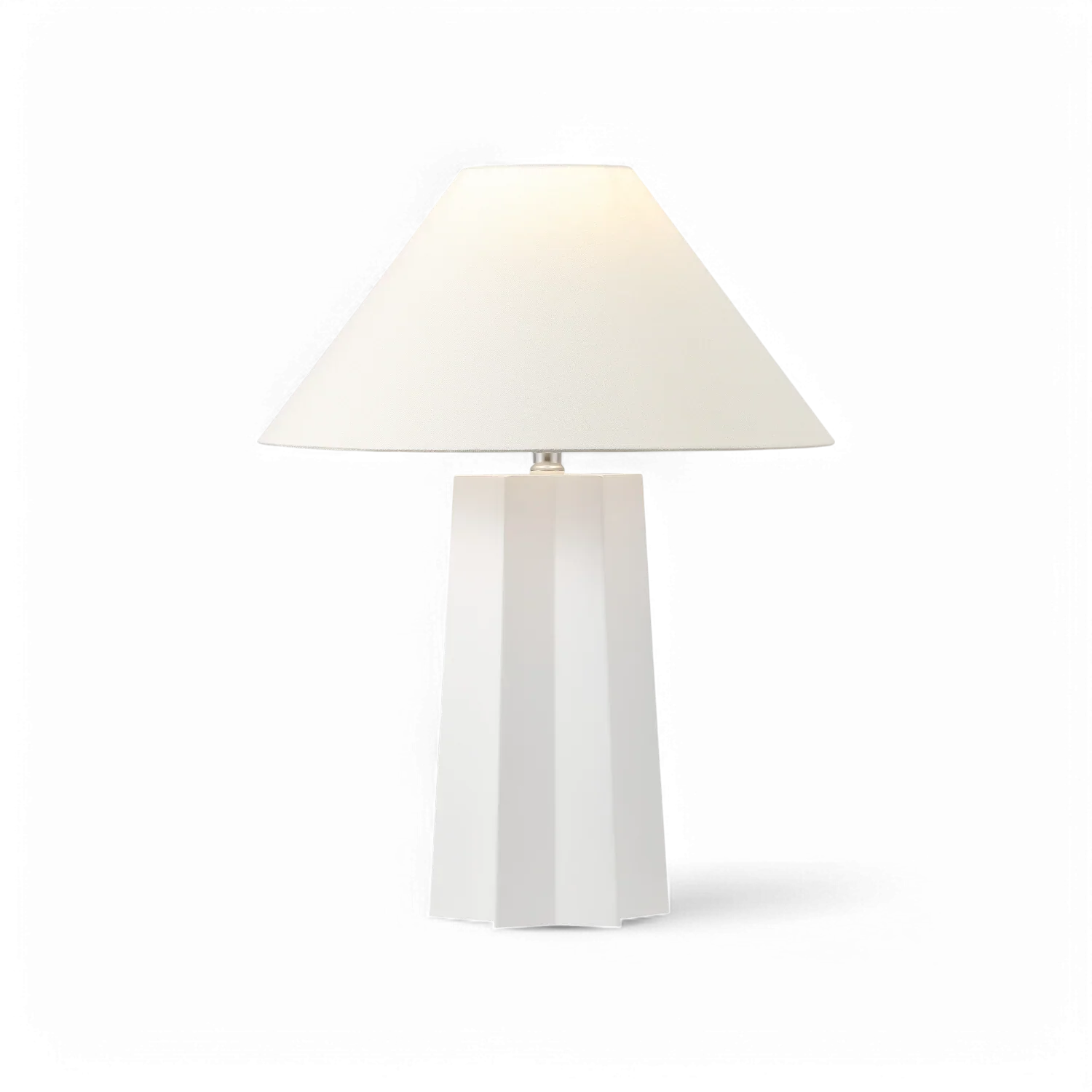 The Zephyr Table Lamp in White is a sleek and modern lighting piece that effortlessly combines minimalist design with elegant functionality. Standing at approximately 22 inches tall, the lamp features a striking white base with a bold, faceted geometric shape that tapers gracefully from a wide, stable bottom to a narrower top. Topping the base is a classic white shade, crafted from a smooth fabric that complements the base's crisp hue. Ideal for a living room, bedroom, or office, the Zephyr Table Lamp offers a harmonious balance of form and function.